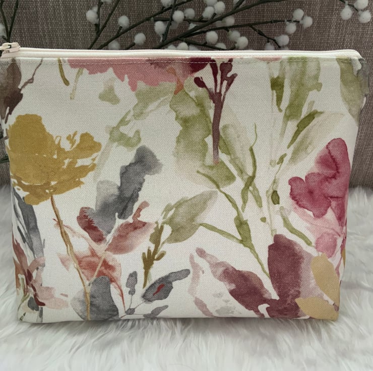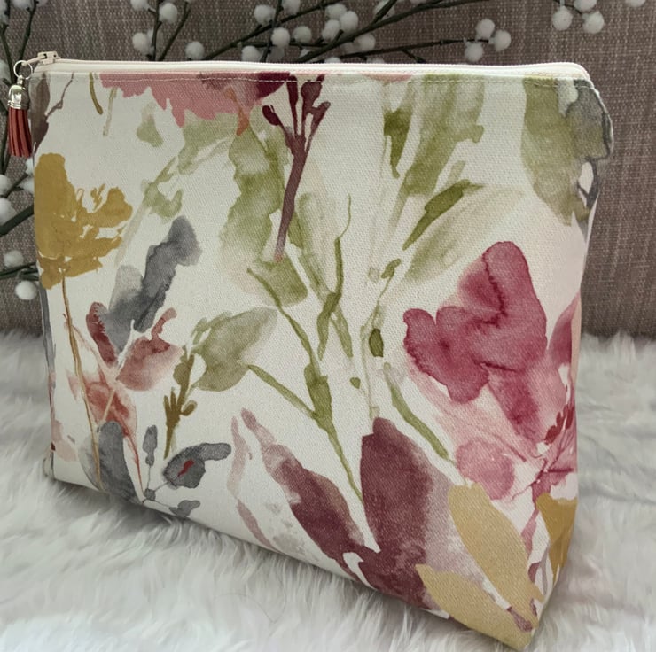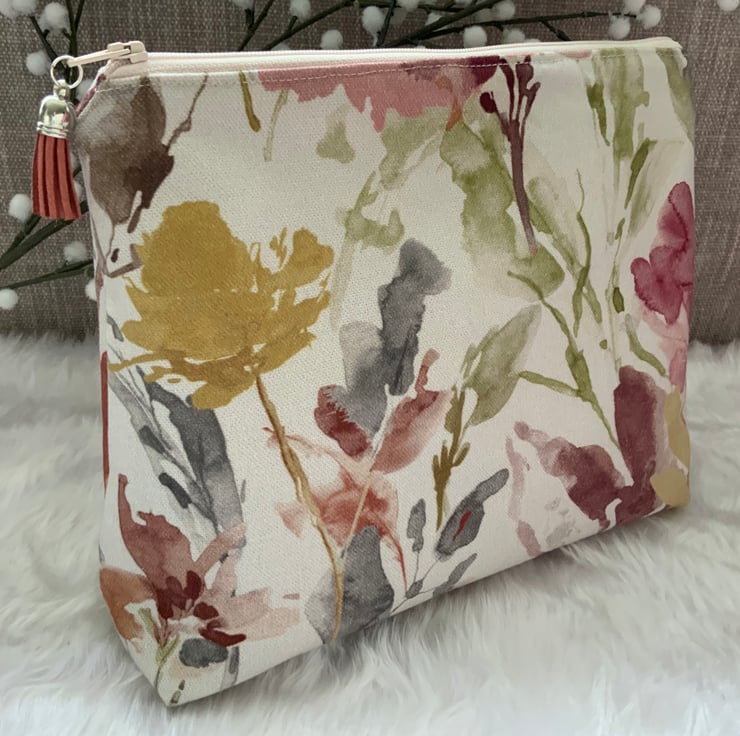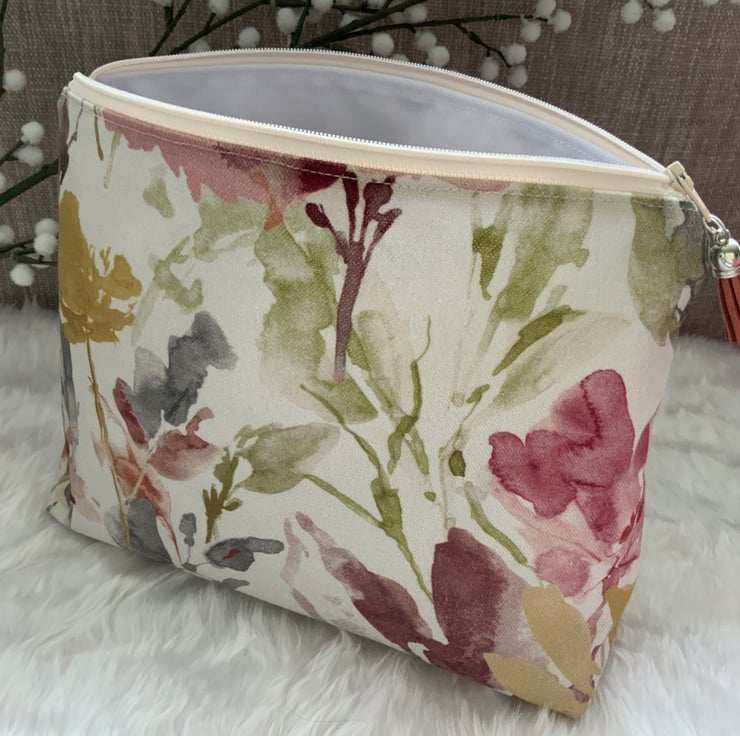 A gorgeous wash bag perfect for storing your toiletries or cosmetics. It would look stylish on display in a bathroom or on a dressing table but also perfect as a travel accessory to carry your toiletries or cosmetics. This bag is interfaced to give it structure and is lined with a white water resistant fabric. The zip is finished with a matching tassel.