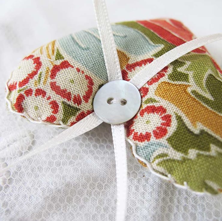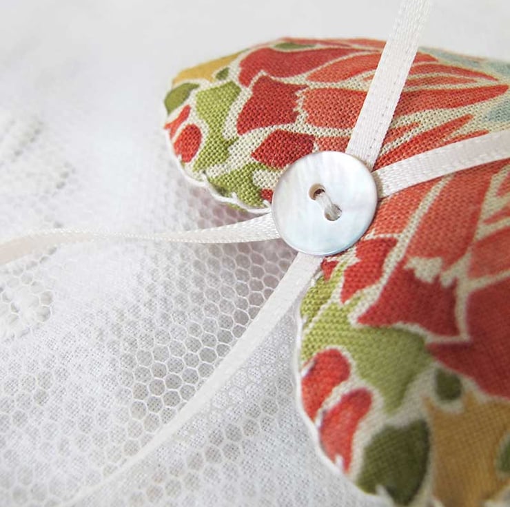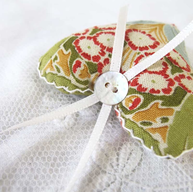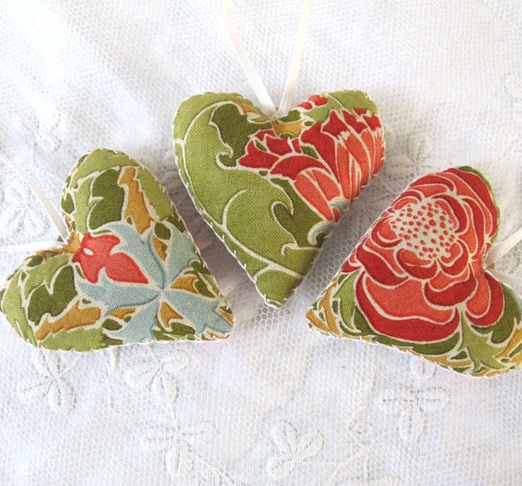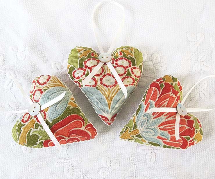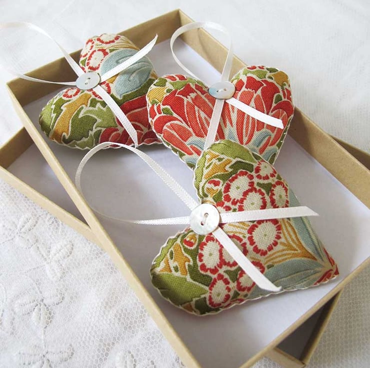 A very pretty little set of three lavender bags - hand made, filled with beautiful scented lavender and then finished with hand embroidery, satin ribbon and pearly shell buttons. The hearts measure 6cm wide x 6.5cm long (not including the ribbon) and are made in a Charles Voysey design fabric. They are a lovely mix of reds, greens, yellow ochre, turquoise and cream.