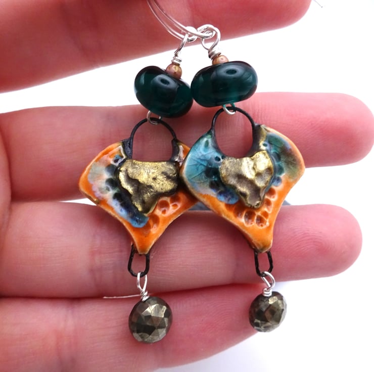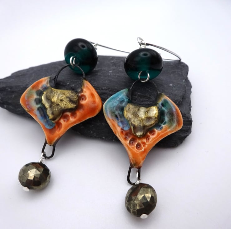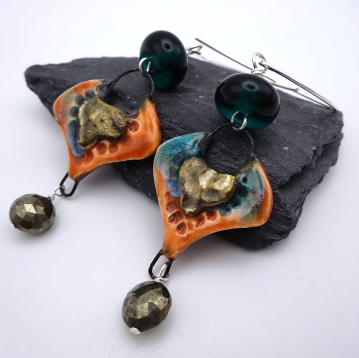 A pair of earrings made with sterling silver ear wires, handmade teal green lampwork glass beads, handmade ceramic connectors and pyrite gemstone beads.