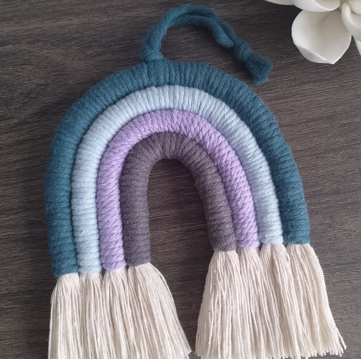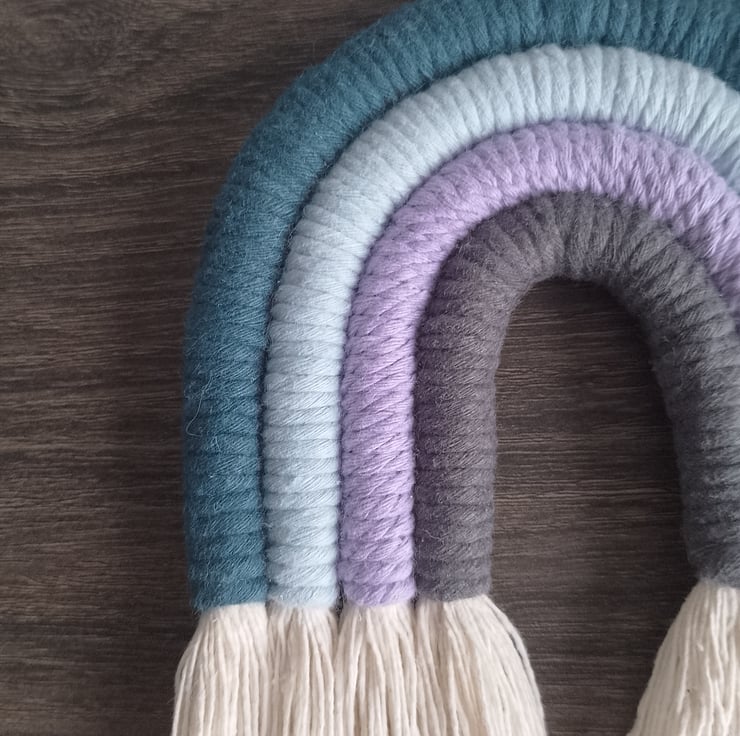 In this pretty macrame rainbow I've used different shades of blue lilac and grey. This rainbow would be a great new baby gift and would look so sweet in a nursery!
