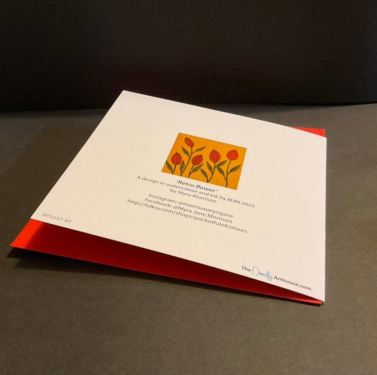This floral card is an original watercolour and ink painting with a modern twist ,The card measures 142x142mm and is printed on 300gms matte card with a silk finish .The card is blank inside for your own message ,and is presented with a complimenting coloured envelope and protected with a removable cellophane sleeve