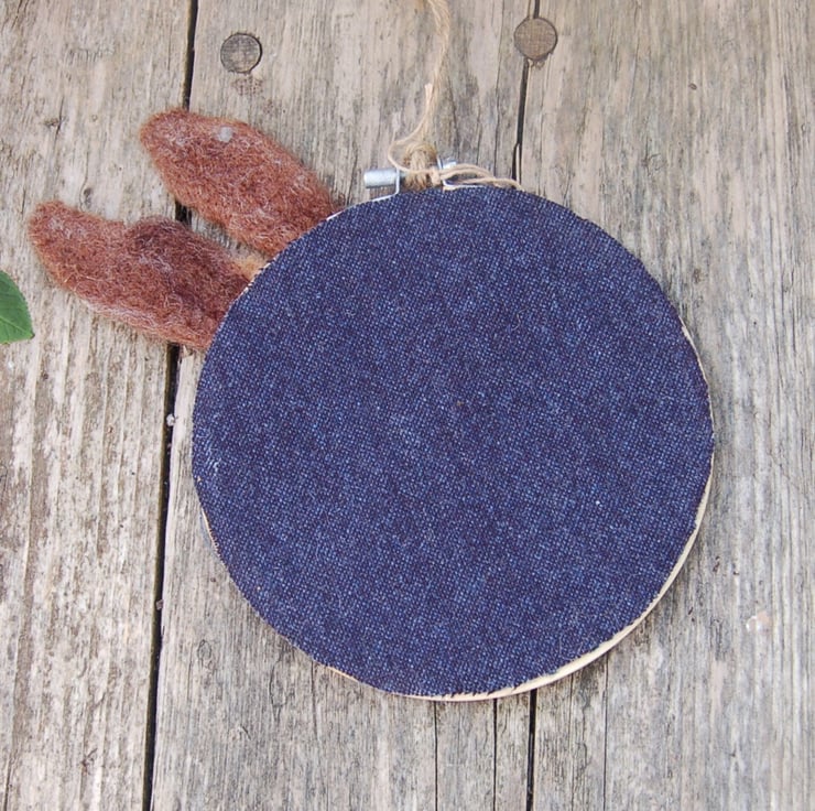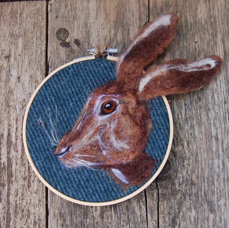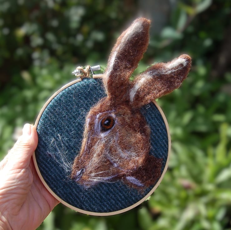 This hare portrait is an all wool picture on wool fabric.