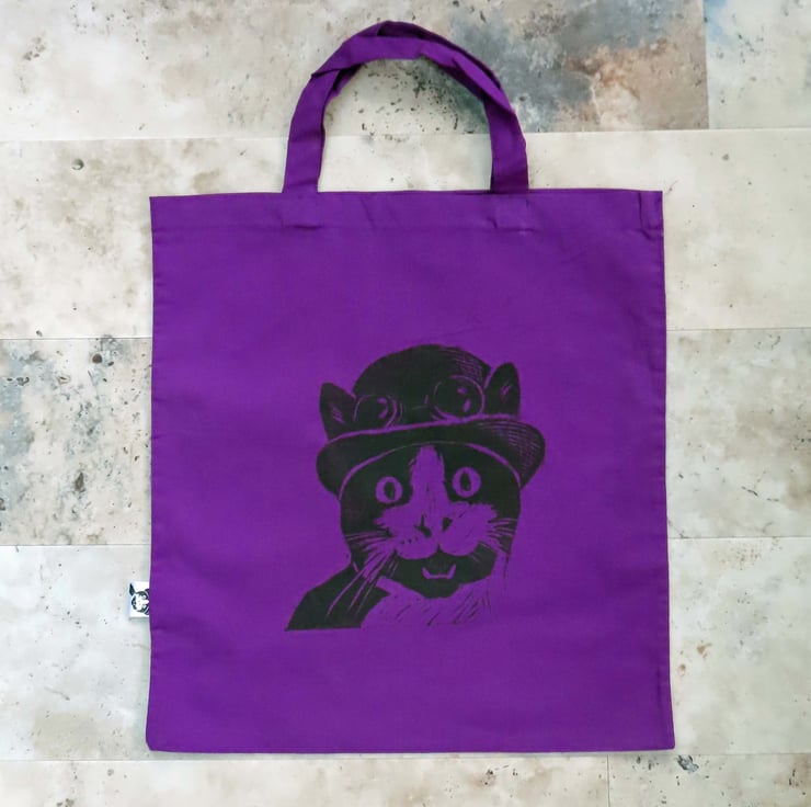 Steampunk Cat hand printed Purple 100% cotton short handled tote bag.