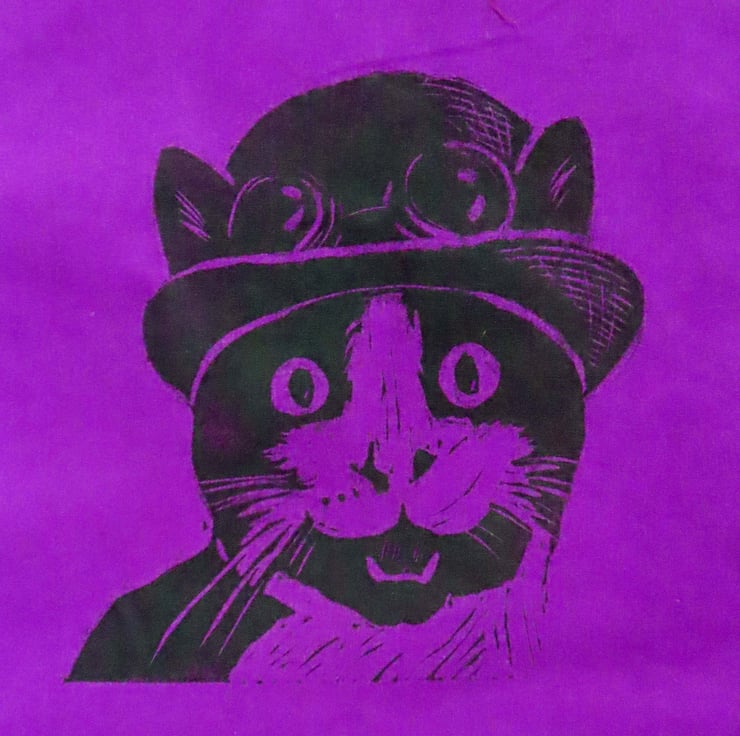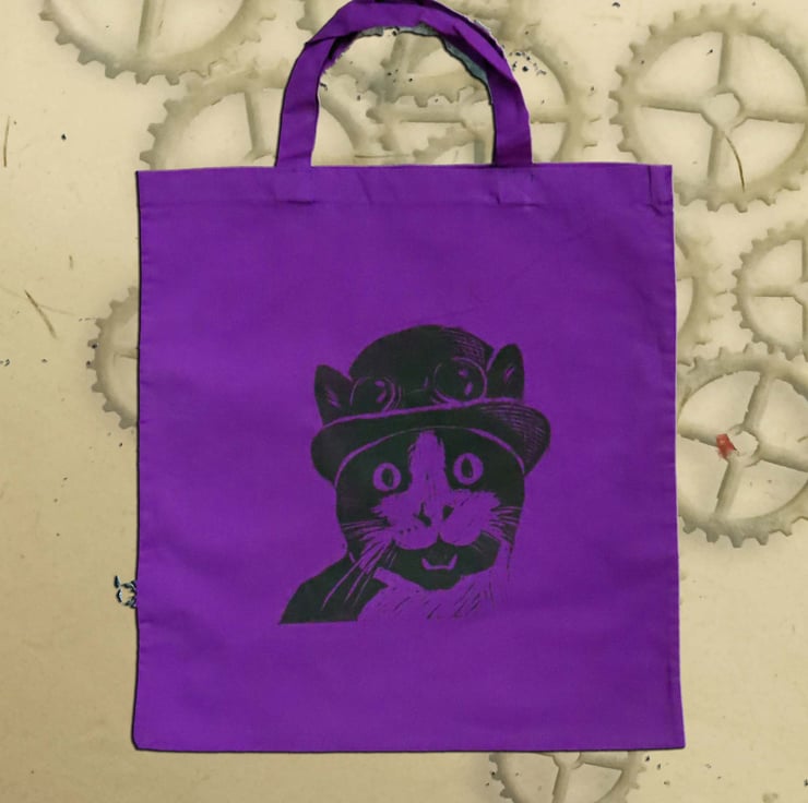 Steampunk Cat hand printed Purple 100% cotton short handled tote bag.