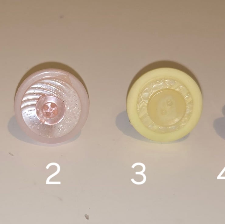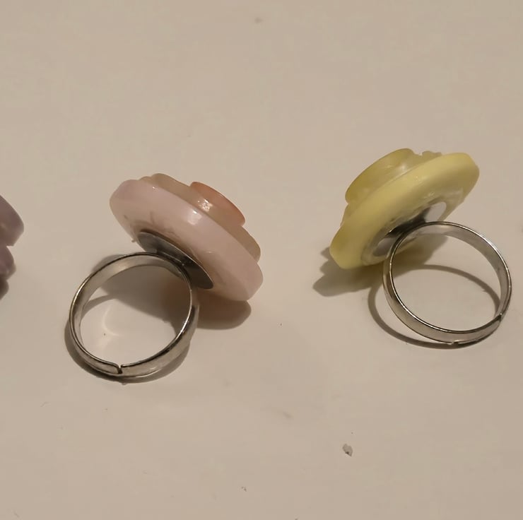 Various rings made by glueing plastic buttons together and attaching an adjustable metal ring.