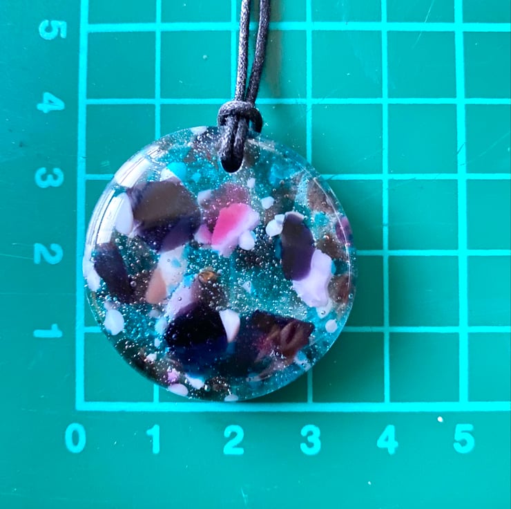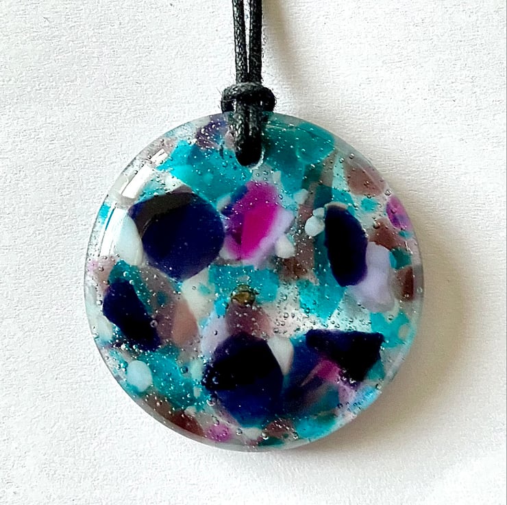 This glass pendant was made by fusing multiple pieces of glass in different shades of purples, lilac, blues and white, together with hand crushed clear glass in a mould. It was fired at 800 degrees Celsius in a specialist glass kiln and gently cooled over a 12 hour period. It measures approximately 3.5 cm across.