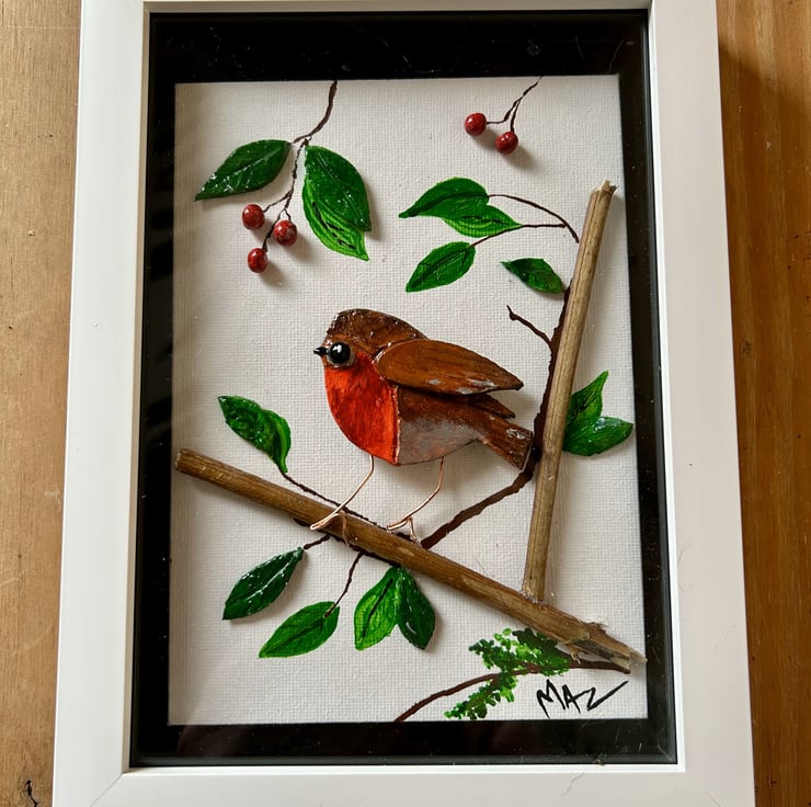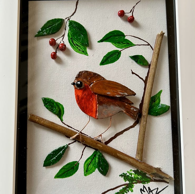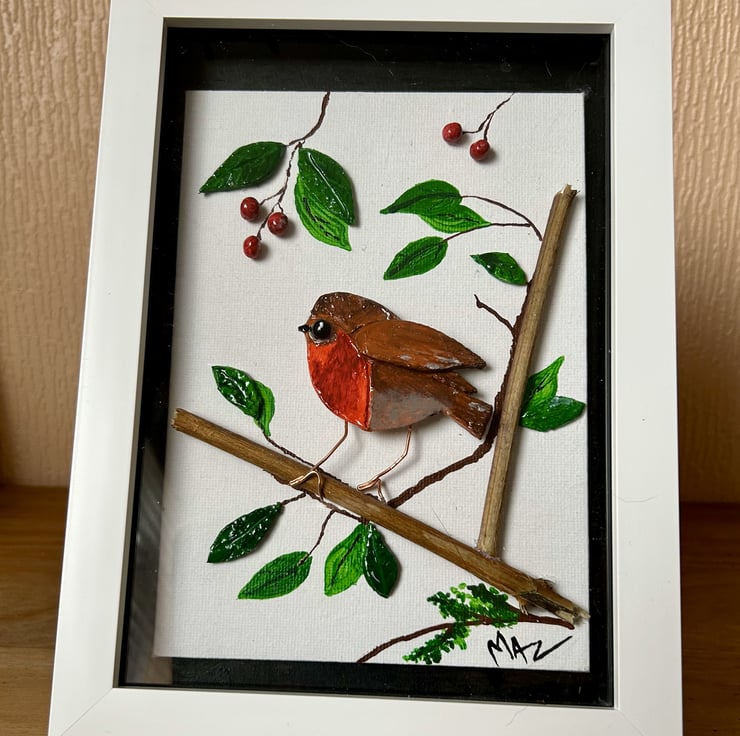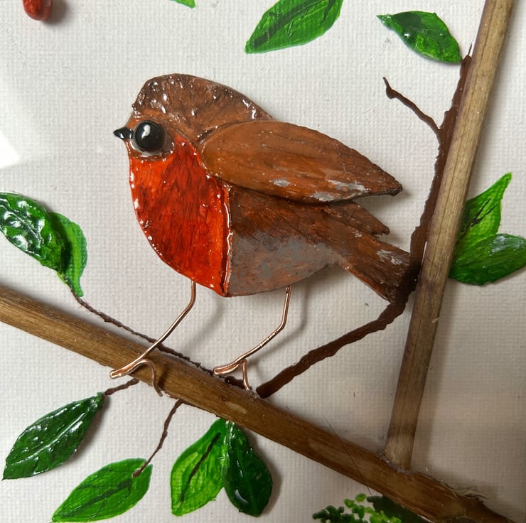 I have created this cute little Robin bird from clay that I have painted in acrylic paint then coated in clear resin and glued to a canvas board. Some leaves are also made from clay others are painted directly onto the canvas with acrylic paint.
