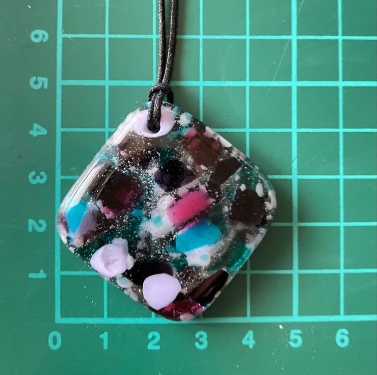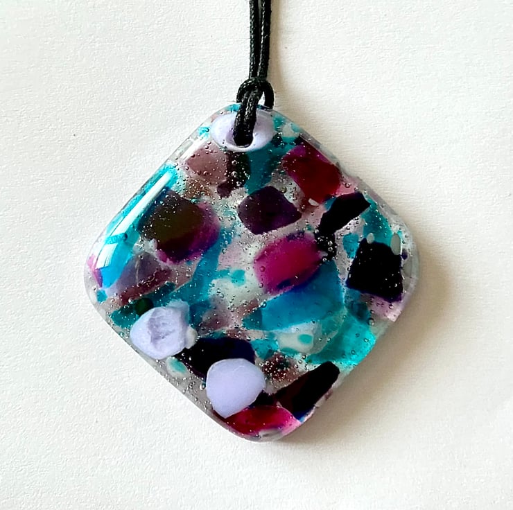 This glass pendant was made by fusing multiple pieces of glass in different shades of purples, lilac, blues and white, together with hand crushed clear glass in a mould. It was fired at 800 degrees Celsius in a specialist glass kiln and gently cooled over a 12 hour period. It measures approximately 4.5 cm across.
