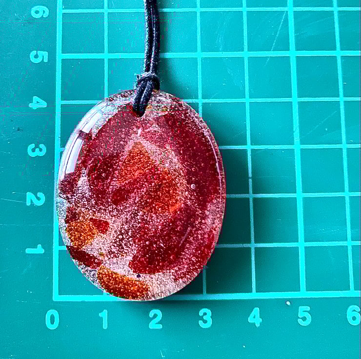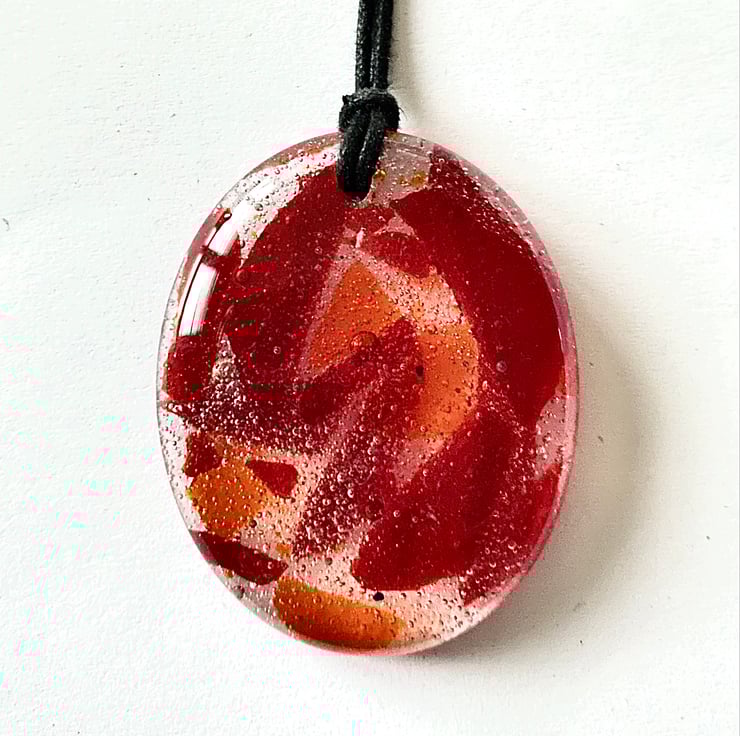 This glass pendant was made by fusing multiple pieces of glass in different shades of translucent red and orange, together with hand crushed clear glass in a mould. It was fired at 800 degrees Celsius in a specialist glass kiln and gently cooled over a 12 hour period. It measures approximately 3.4 cm across and 4.2cm long.