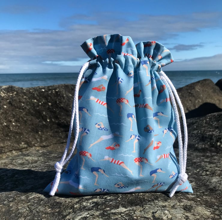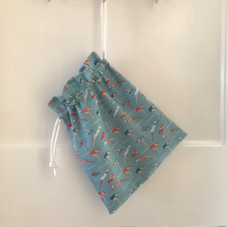 The bag measures approximately 28 cm x 25 cm and is made from a lightweight cotton polyester fabric and is lined with water resistant fabric. The bag has a fab print of swimming ladies on an acqua blue background. The lining fabric is also acqua blue and the cord drawstrings are white. The drawstrings have been treated with Fray stop on the ends but as they are a natural fibre there may be fraying with use.