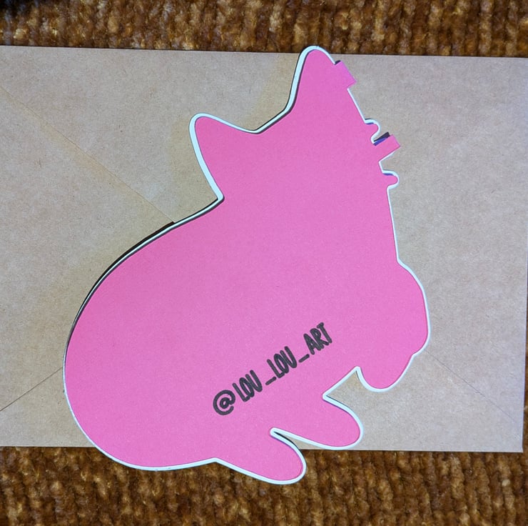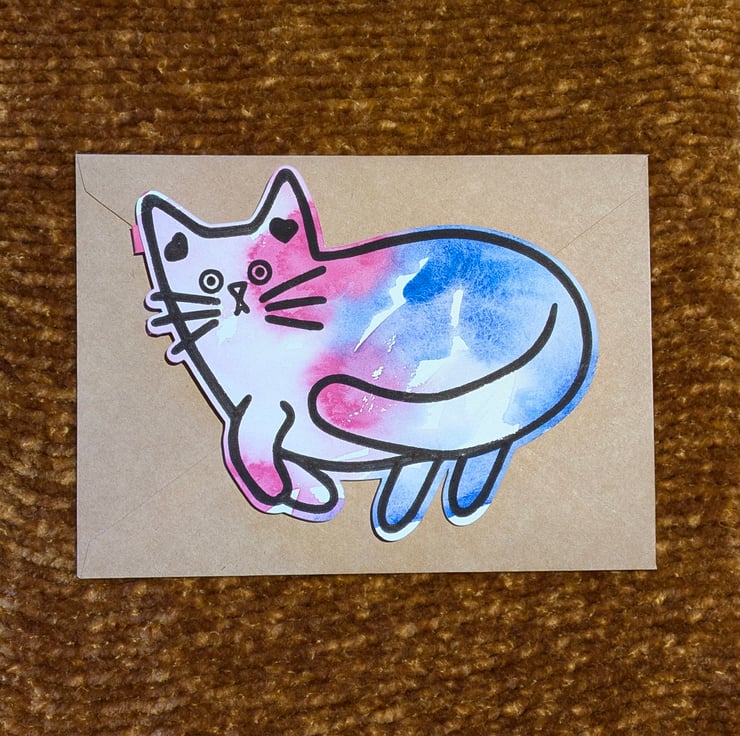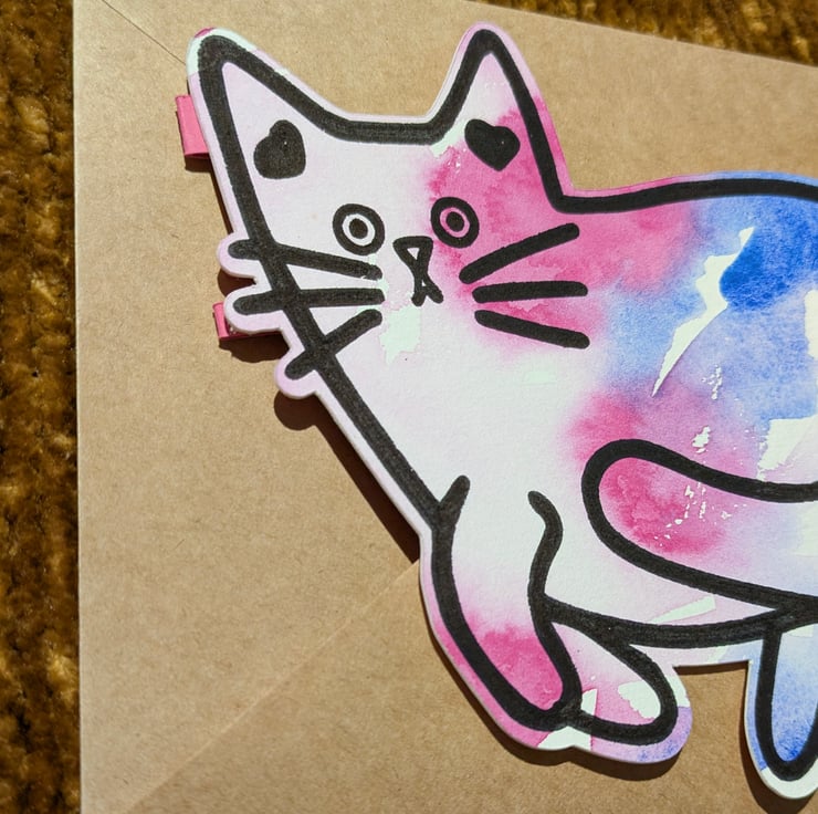 This cat is hand-painted with layers of pink and blue watercolour hues, it has a pink card inner.