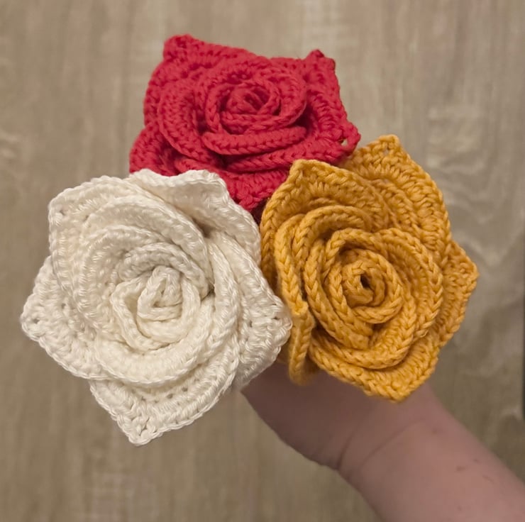 I wanted to make roses for Valentine’s Day but I wanted to change the sizes of the blooms so they didn’t all look exactly the same. I tried different colours that complimented each other so it would look more appealing and spent time crocheting different size flowers to see which would be nicer to look at.