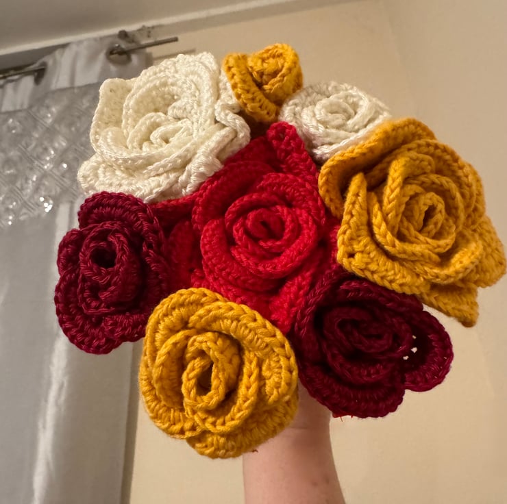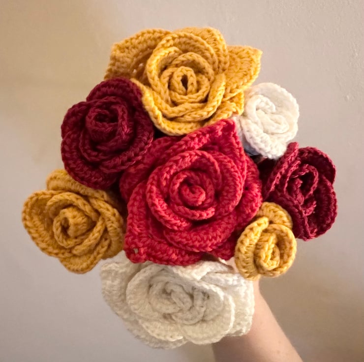 Handmade crochet flower/rose bouquet. Consists of 3 full bloomed roses, 3 partially closed roses and 3 closed rose blooms. Made with 4ply cotton and 2.75mm crochet hook.