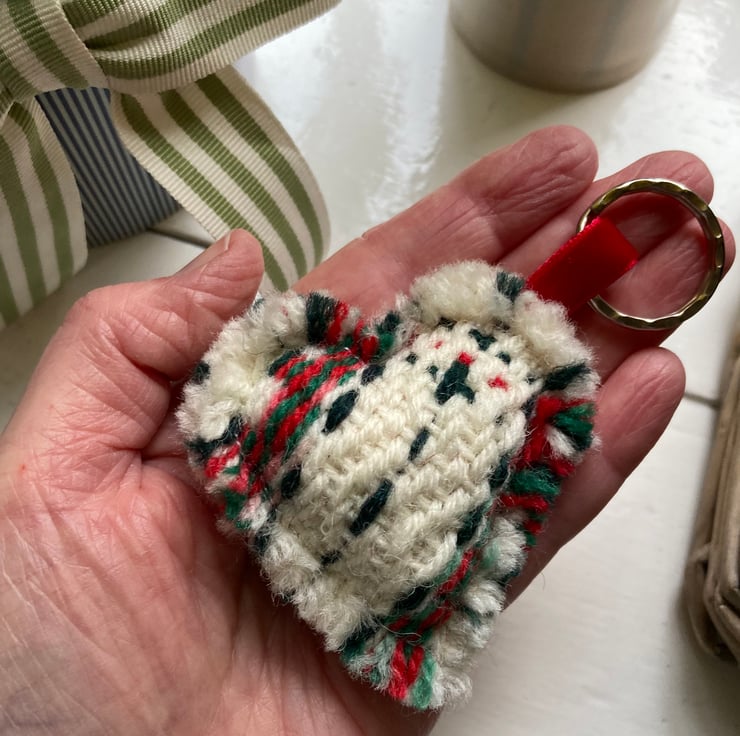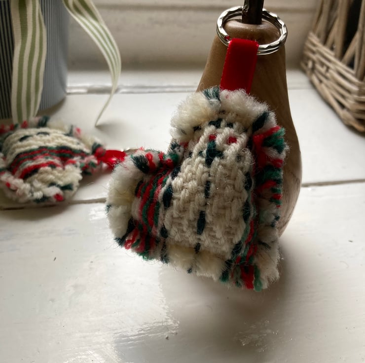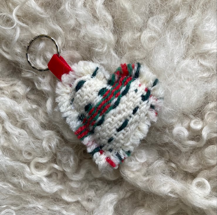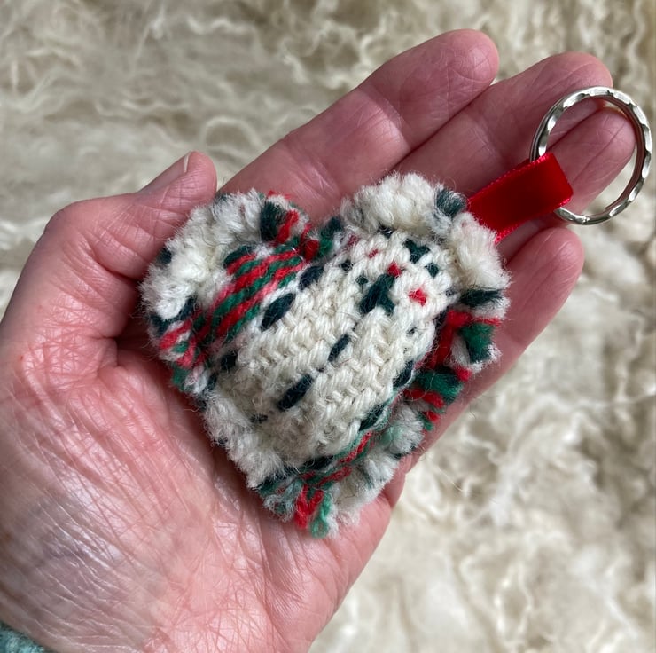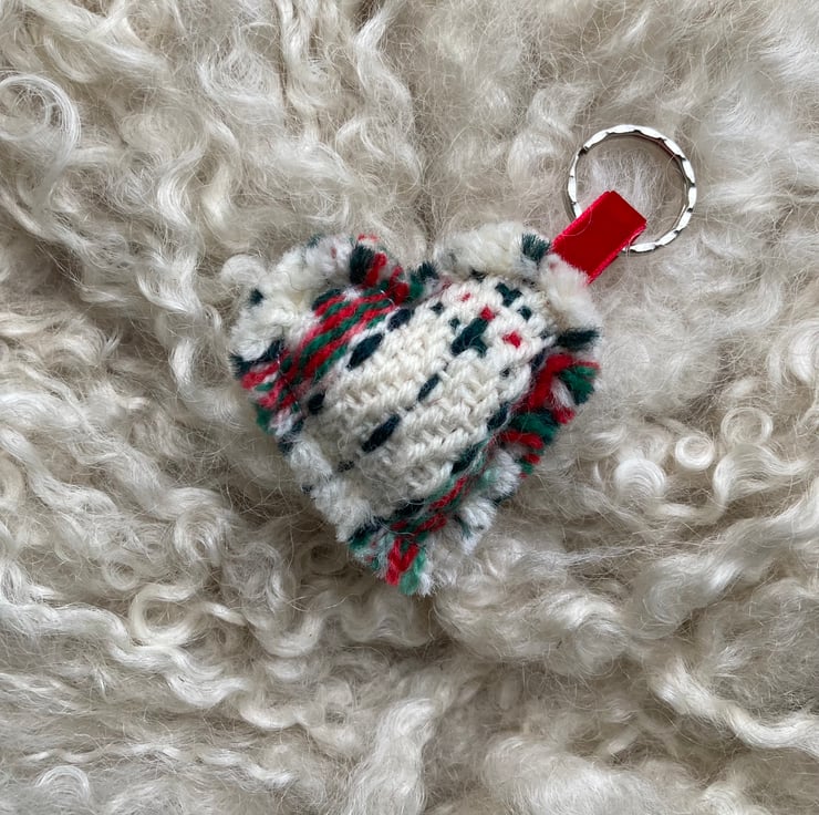 Handmade using our handwoven wool fabric. A marble colour mix of red & green Welsh wool with a creamy white Jacob sheep yarn - all British wool. Finished with a red velvet tab and a nickel plated ripple effect keyring
