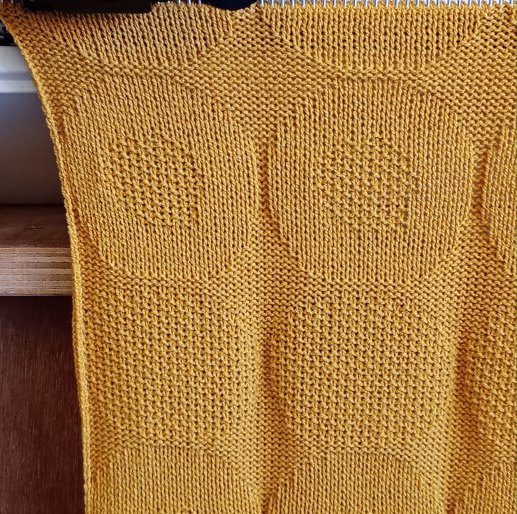 The design features spots and dots using purl and moss stitch in a circular design.
