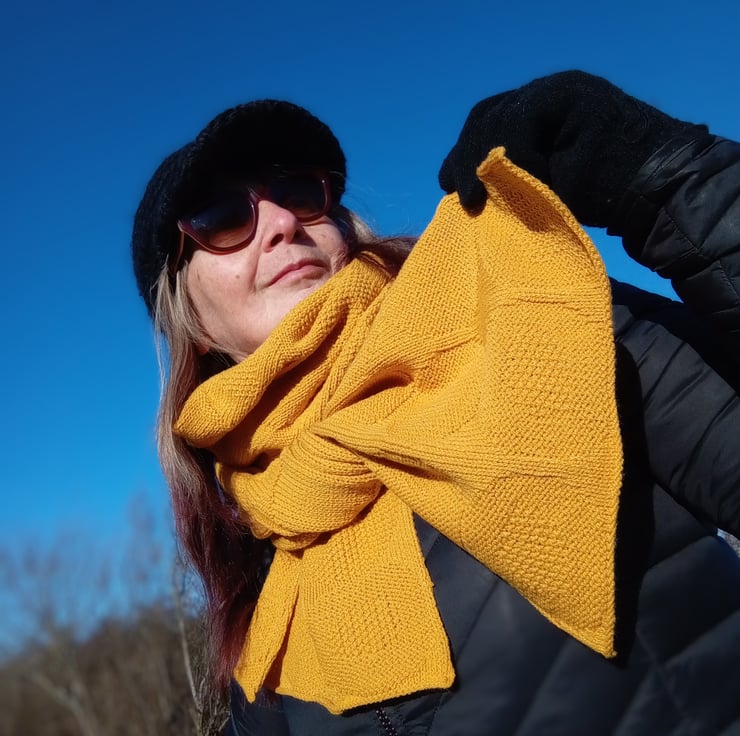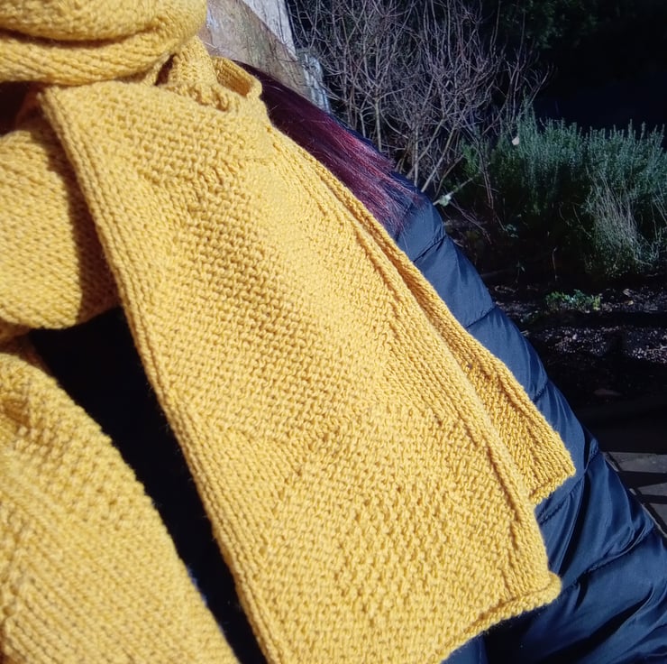 Weight of scarf is 175 grams (6oz) (excluding tension/practice swatches).