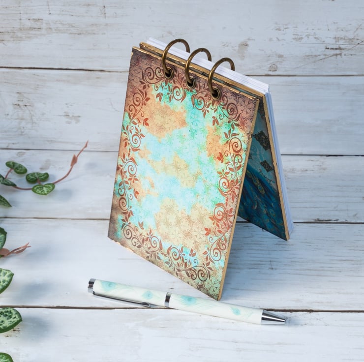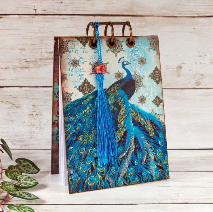 Beautiful vintage style pocket flip pad / reporters notebook, made to last with wooden covers and decorated with blue peacock prints. This mini notebook is A6 in size and slips into bag or purse making it perfect for quick notes and shopping lists. When not being used it can stand on a desk or shelf like a mini billboard, looking exceedingly pretty and highly decorative. They also make fantastic mini photo albums.