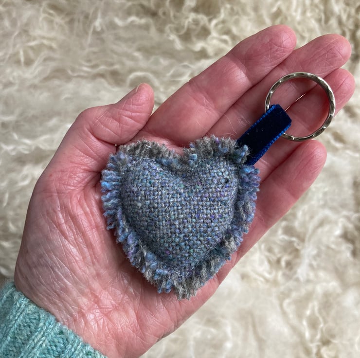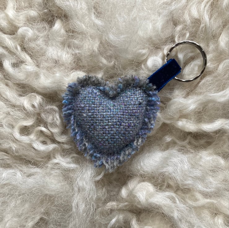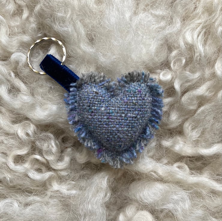 Handmade using our handwoven wool fabric. Woven cloth using Donegal Tweed wool. Finished with a navy blue velvet tab and a nickel plated ripple effect keyring