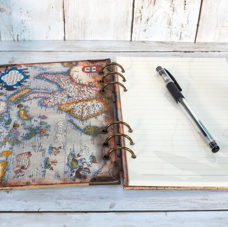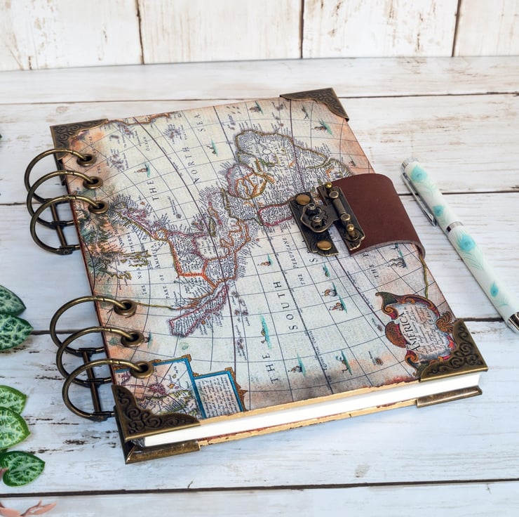 This vintage style boho note book is refillable and takes standard A6 paper or you can simply cut a sheet of A4 into 4 pieces and use a hole punch. Digital paper to download and print available in my store.