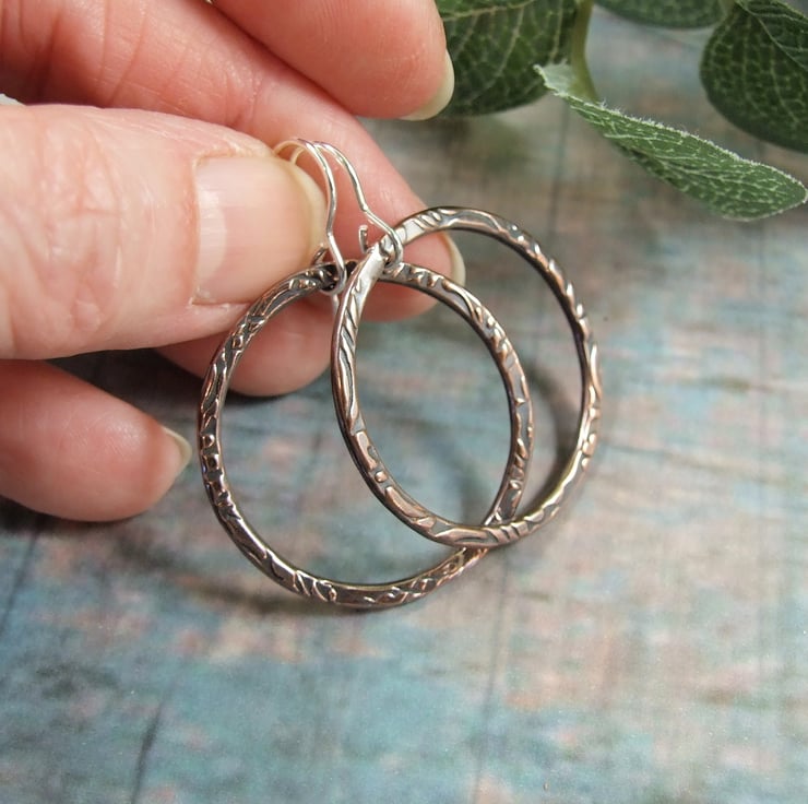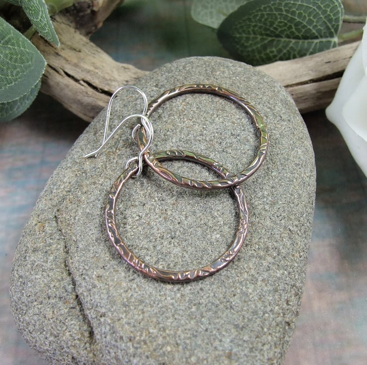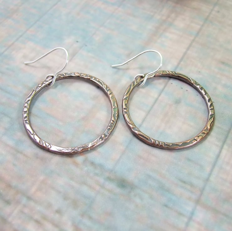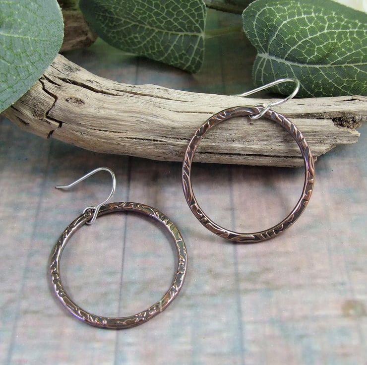 I have created the hoop shapes from copper wire shaped into a circle, soldered closed then textured with a steel pattern plate and given them an oxidised or antiqued finish. Fitted to sterling silver ear wires..