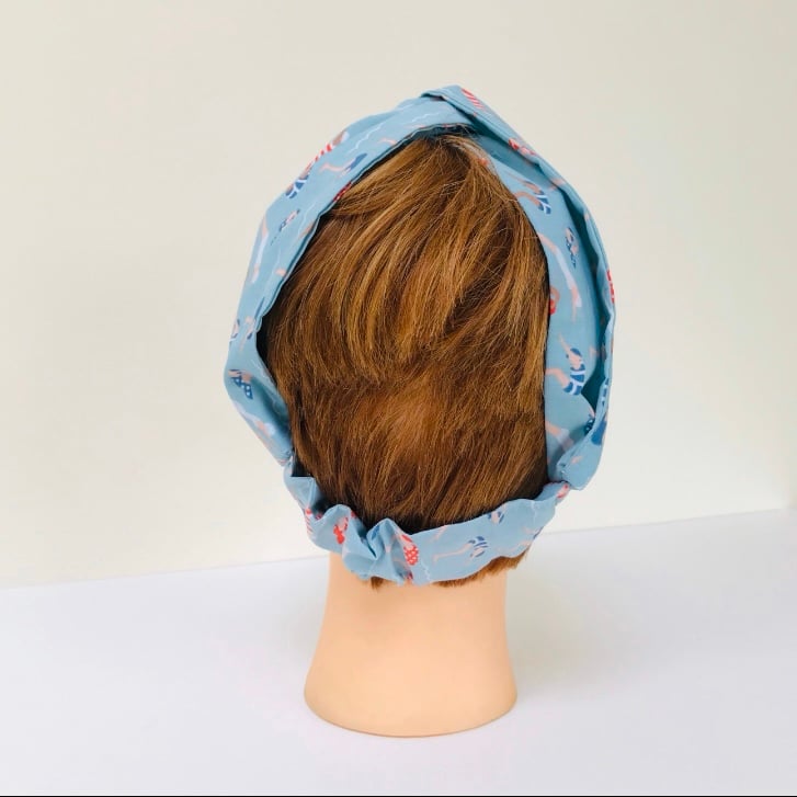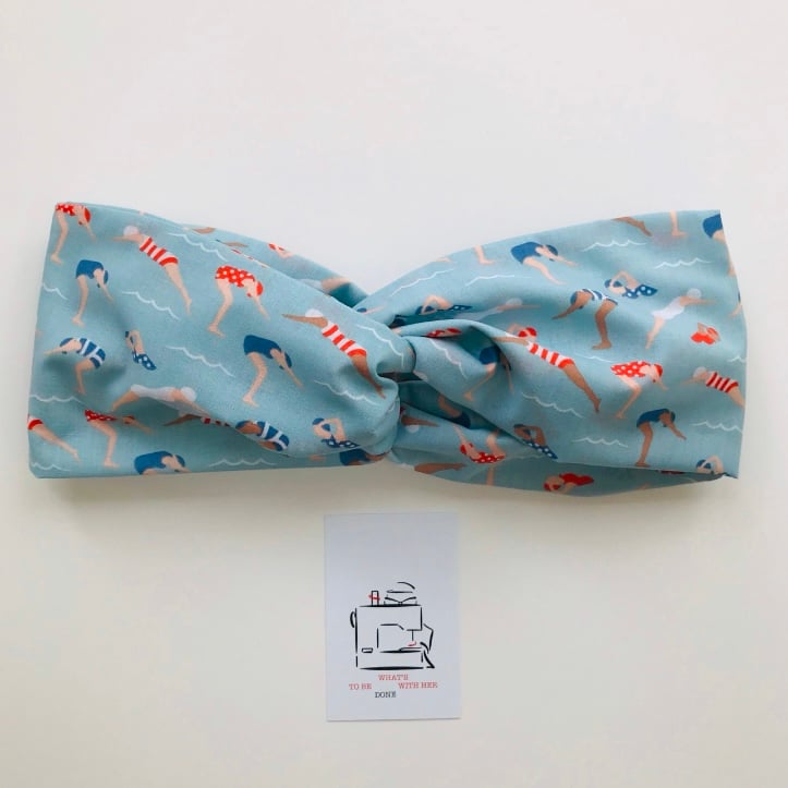 I’ve made my Swimming Ladies headband using a lightweight cotton polyester fabric. The headband has a turban twist at the front and an elasticated back band so it should fit an average size head.