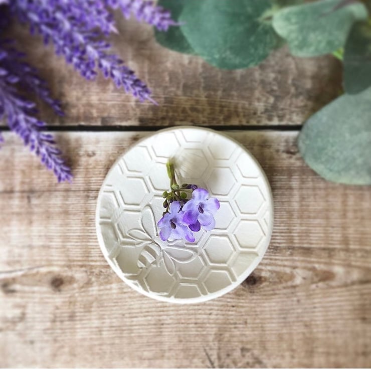 Made from air-drying clay, it's lightweight and robust, with a tactile matte finish and embossed honeycomb pattern with bees. Each dish is cut from a larger patterned slab, so every dish is unique and may differ slightly from the images shown.