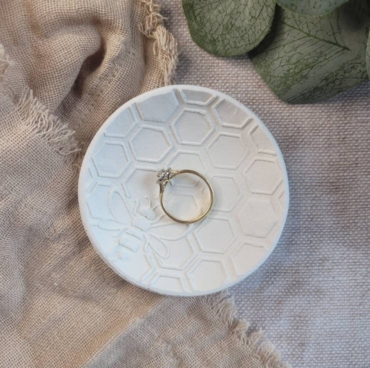 This beautiful, textured clay trinket dish is a stylish home for your rings, earrings, and other small trinkets.