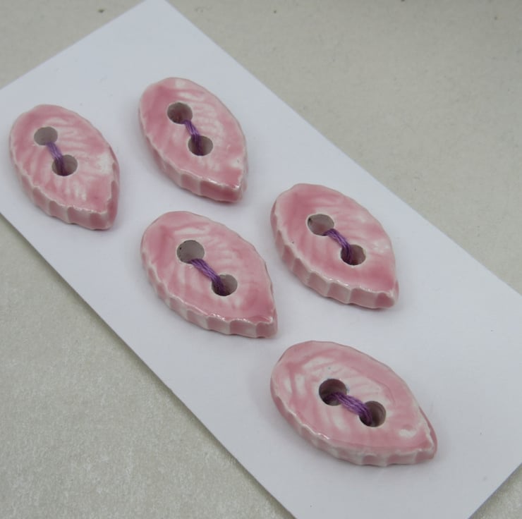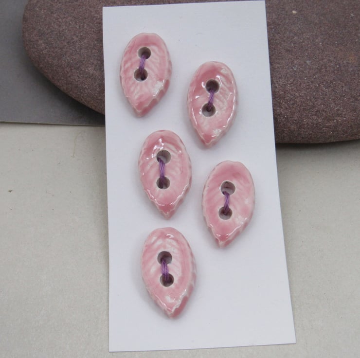 5 small stoneware buttons cut to a toothed leaf shape and finished with a pretty shell pink glaze