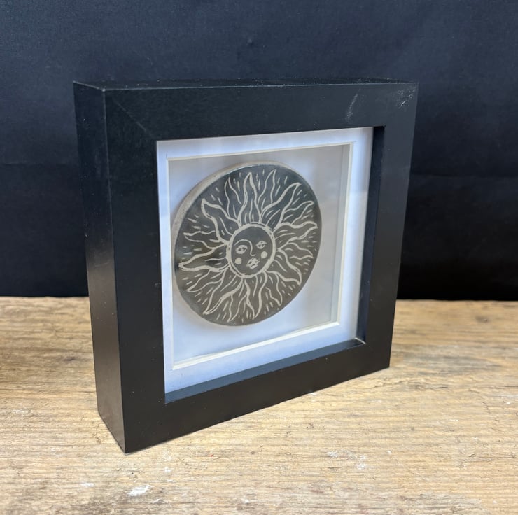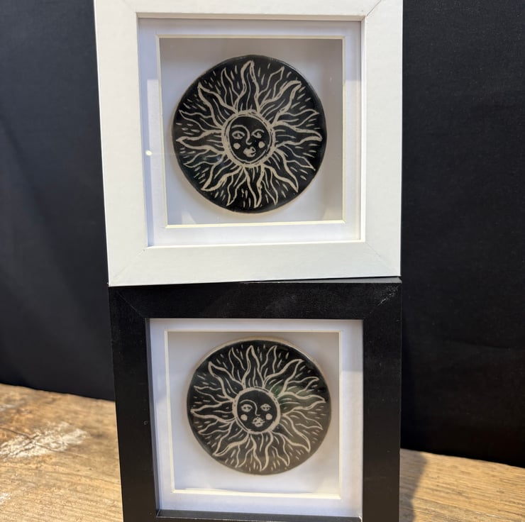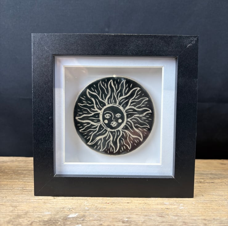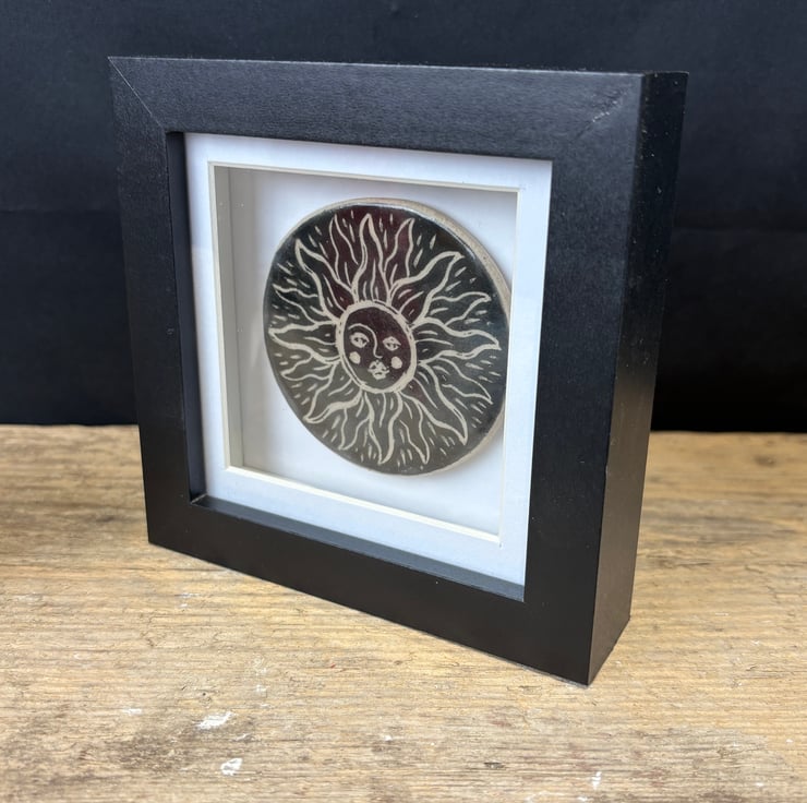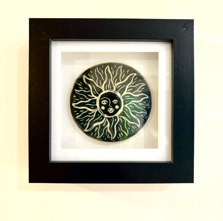 A small circular glazed stoneware ceramic tile with etched (sgraffito) sun face design.