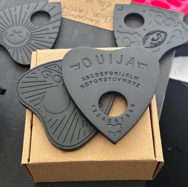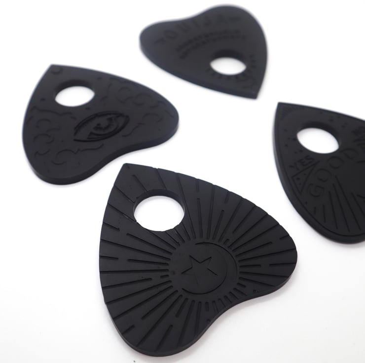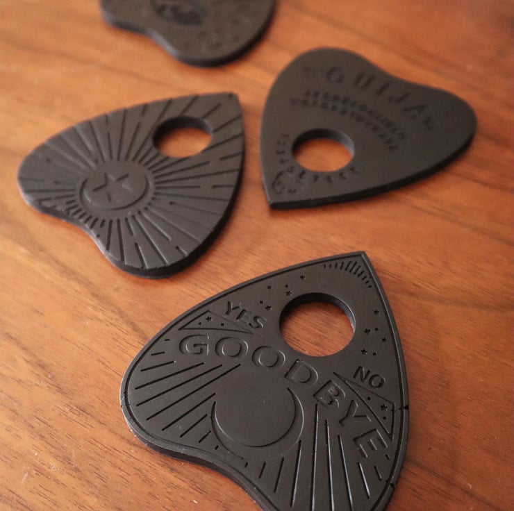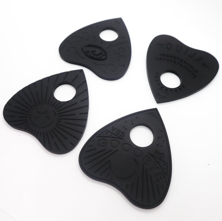 Add a touch of gothic charm to your home with our Set of 4 Black Jesmonite Ouija Planchette Coasters with Optional Gold Embellishments. These handcrafted coasters combine functionality with dark elegance, perfect for those who appreciate alternative and vintage-inspired decor.