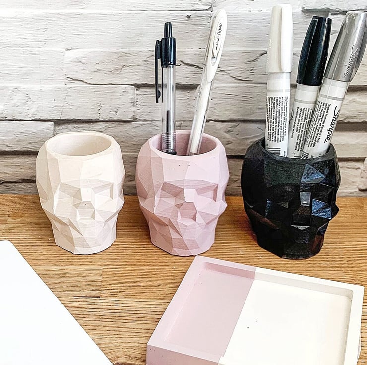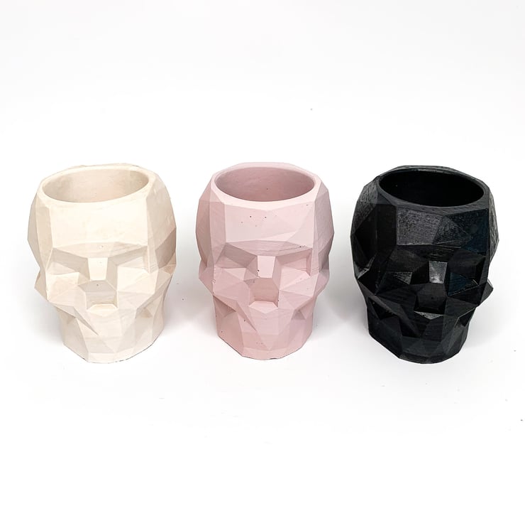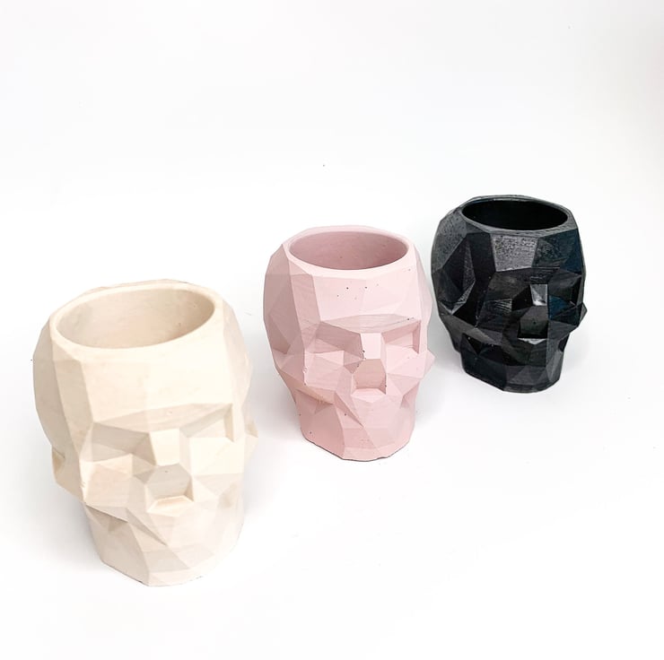 Geometric skull pots! These make great planters, desk tidies and even jewellery holders. They'll also hold candles and tealights. Available in a variety of colours and finishes, they look stunning in any home and make great gifts!