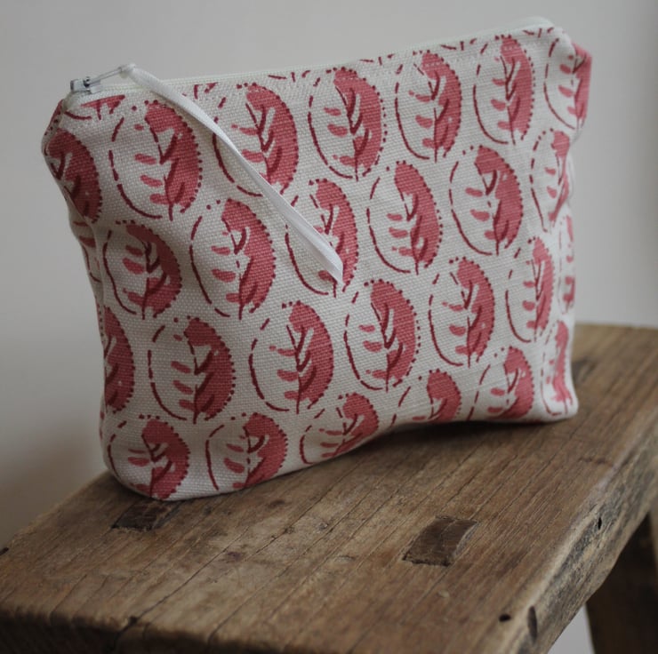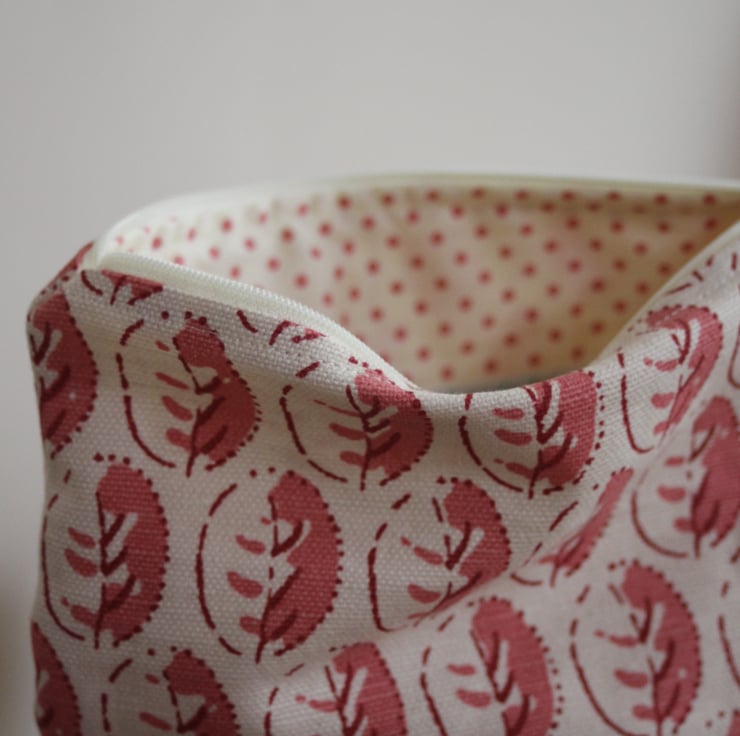 A simple, small, zip up pouch made from a remnant of new Vanessa Arbuthnott 'Little Leaf' fabric in shades of cream and raspberry. It is lined with cream and pink polka dot cotton and has 'boxed' seams.