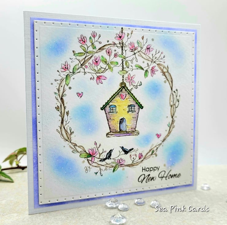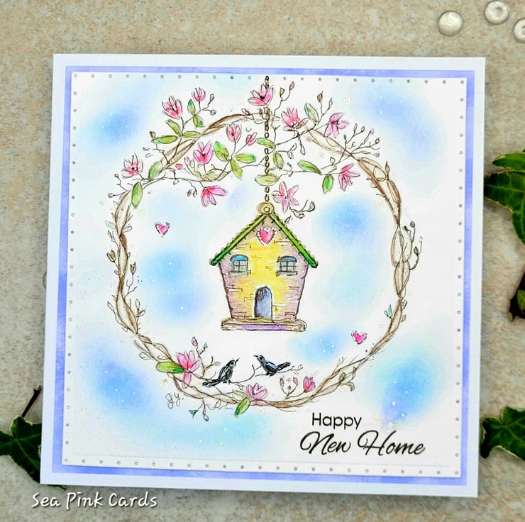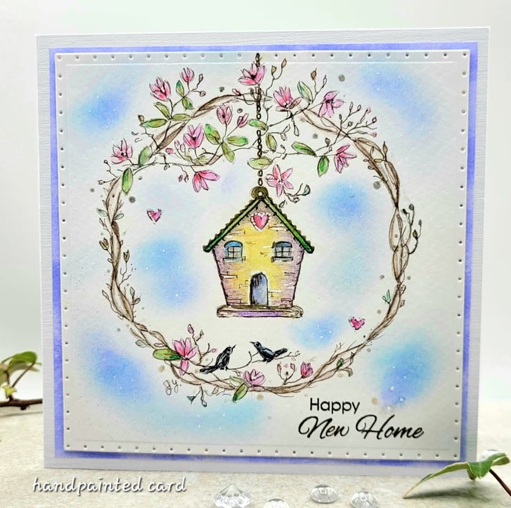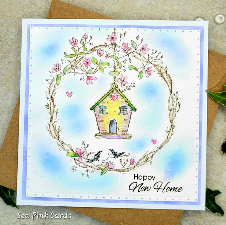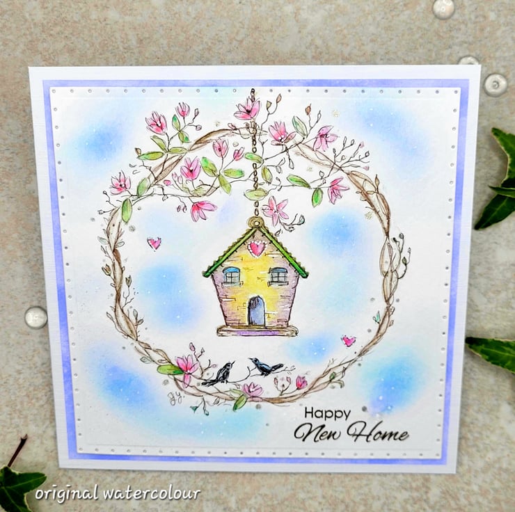 A birdhouse new home card that has been sketched by hand and painted with watercolours. The lovely little birdhouse is set in a wreath of magnolia branches and there are two birds and a blue sky too! This one-of-a-kind card has been individually handpainted in my craftroom and is not a printed card. The small stamped sentiment reads happy new home in dark brown archival ink.