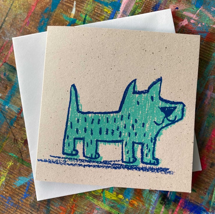 A vague dog -maybe a Westie? On natural flecked card. I call him Minty.