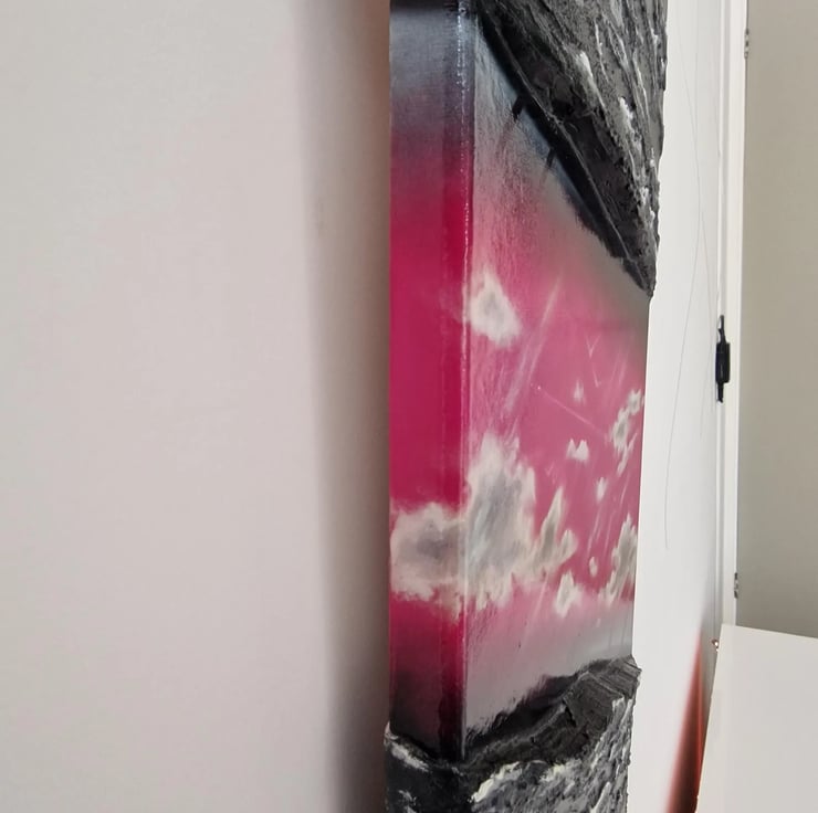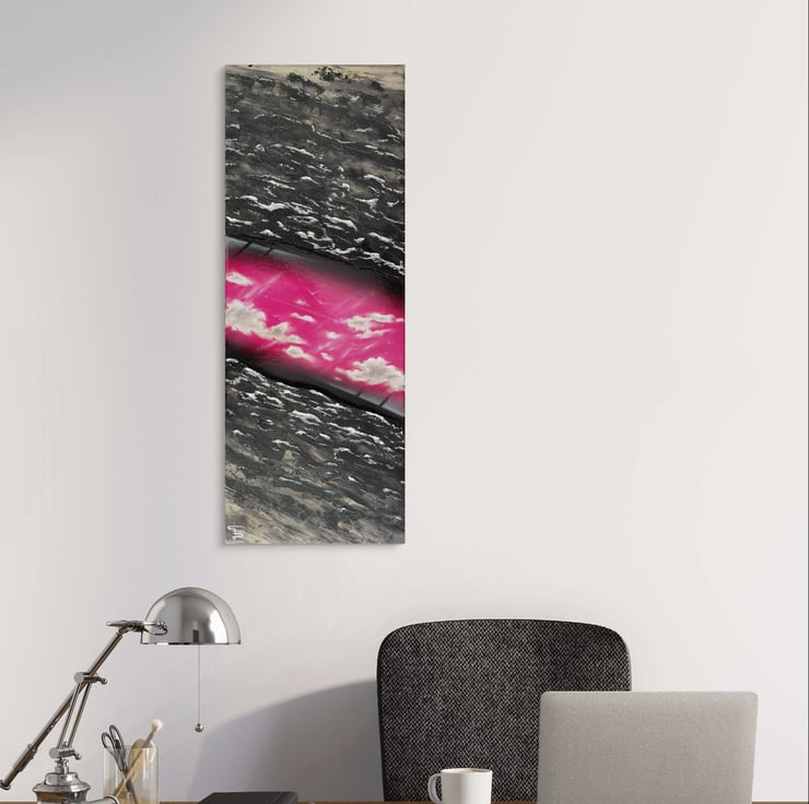 This decorative unique style original painting makes any office, lounge, bedroom or living room exceptional. It intends to bring eye catching warm atmosphere wrapped into a very modern design. Eases the mind and it is very relaxing by taking the watcher above the infinite clouds on the pink sky. Features heavy texture on the top and bottom dark grey part, the middle pink sky sinks between.