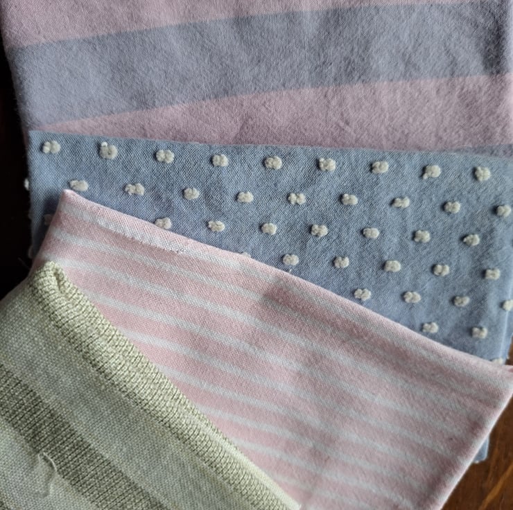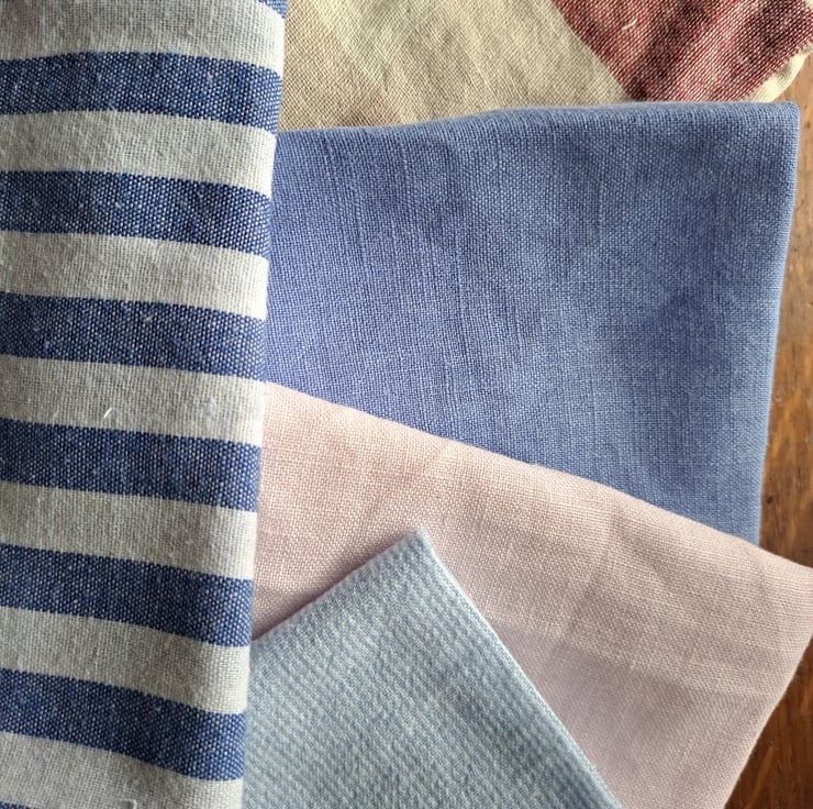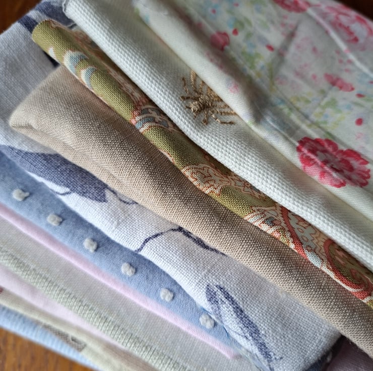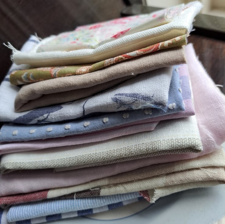 The fabric equivalent of the whale music they play at the salon, this bundle of 12 pieces is all about soft and gentle relaxation. All shapes and sizes of rescued and remnant cottons and linens. Empty your mind...