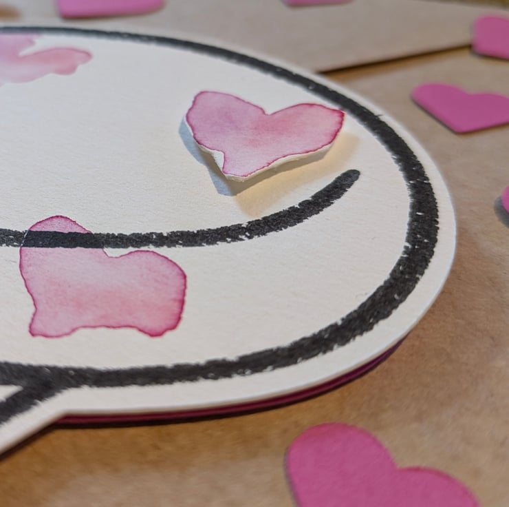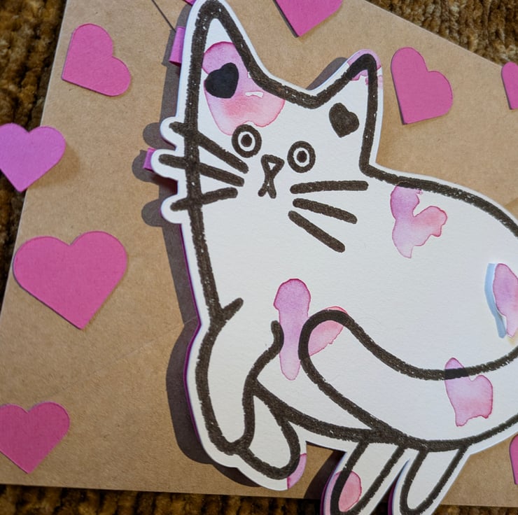 This cat is painted with stylised love hearts in a pink colour, including a raised heart detail (as seen on photo). with a pink card inner. It also comes with cardboard love-heart confetti as pictured!