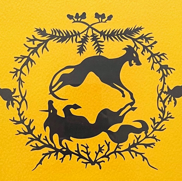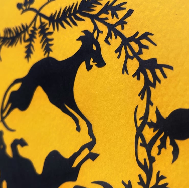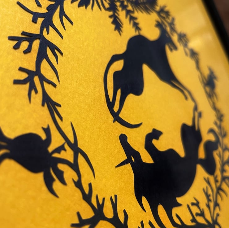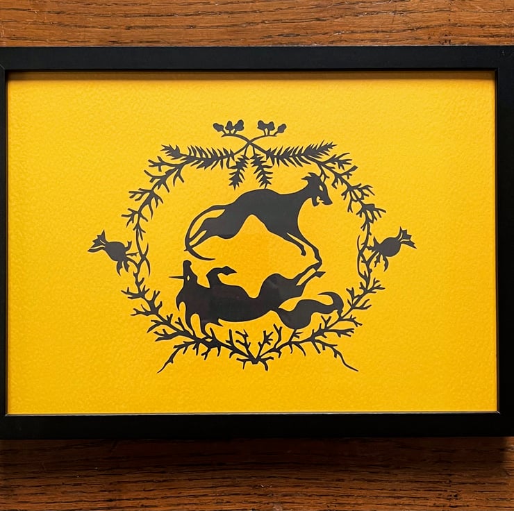 This is a framed original, not a print. It is hand-cut from an original design on 110gsm black paper, then mounted on sunny Yellow Orange-coloured acid-free 300gsm textured paper. It's safely housed in a complimentary black composite MDF frame with a hardboard backing & glass panel. The metal hardware is already installed, making it ready to hang!