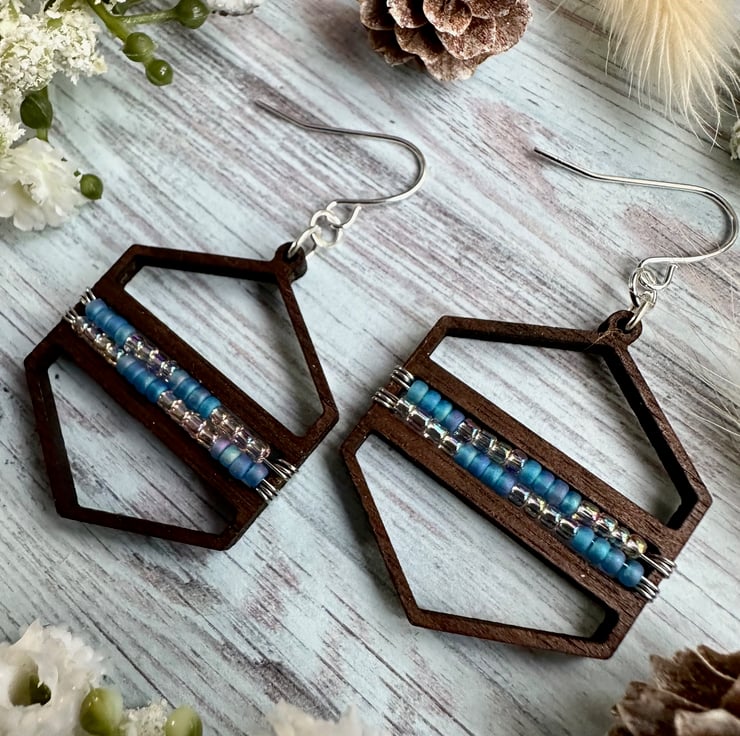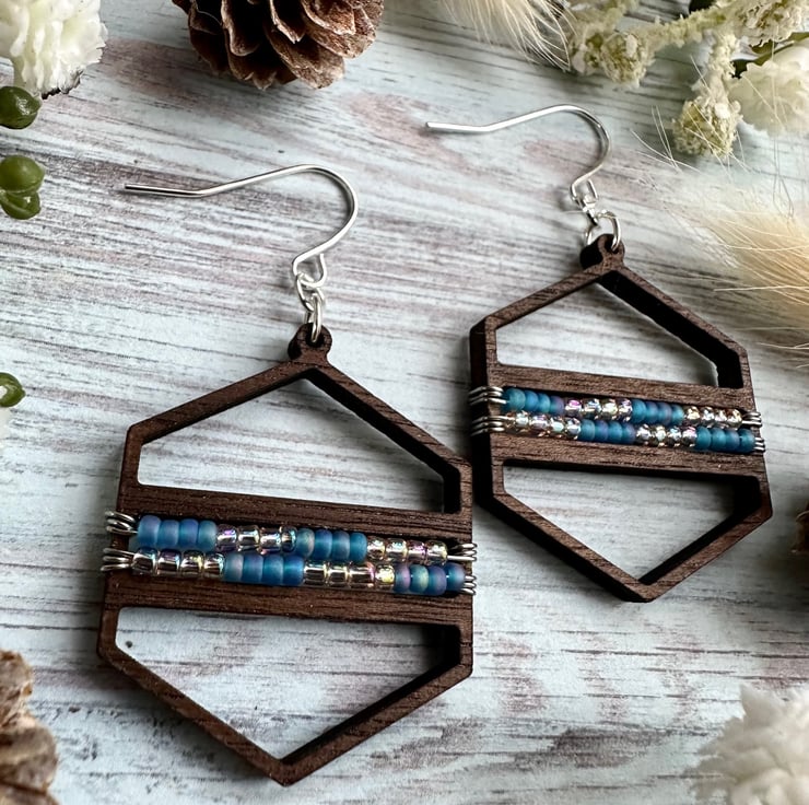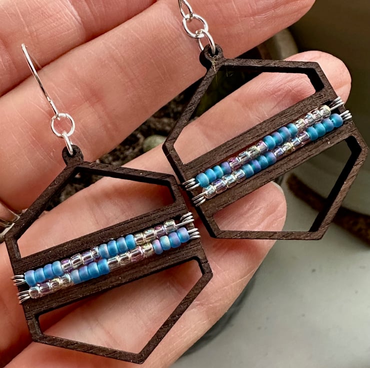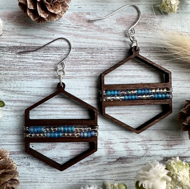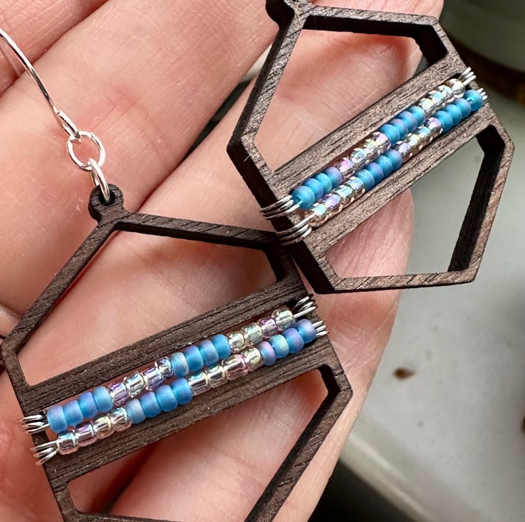 The walnut plywood wood is sealed with hard wax old before being expertly cut in a laser machine, and the pieces then cleaned and polished before I add two rows of glass beads on a silver wire.