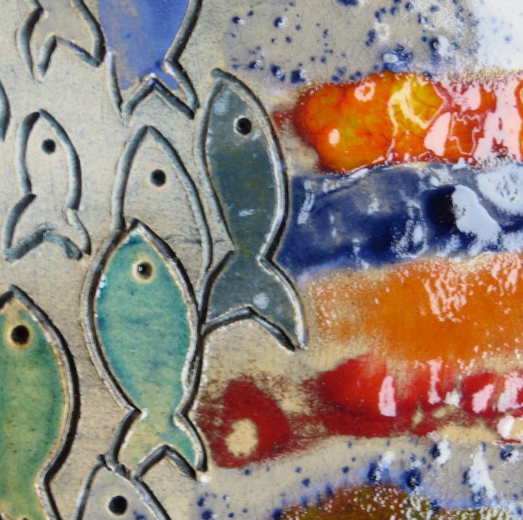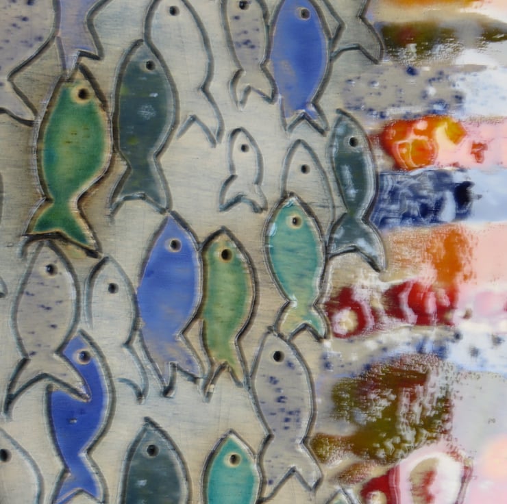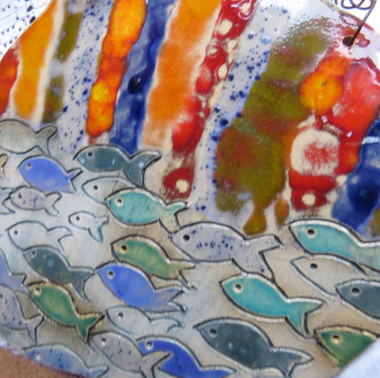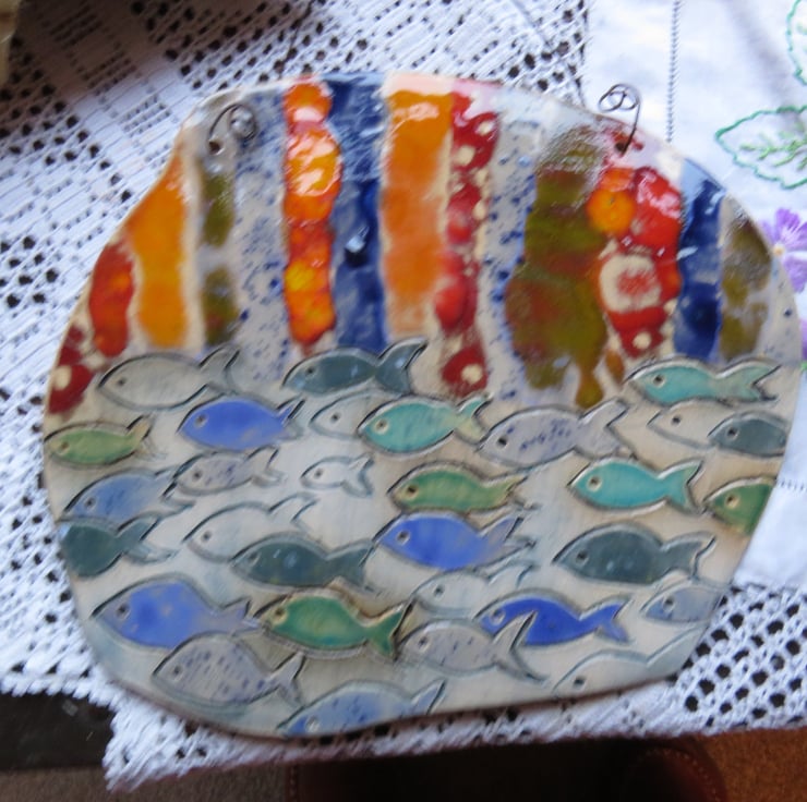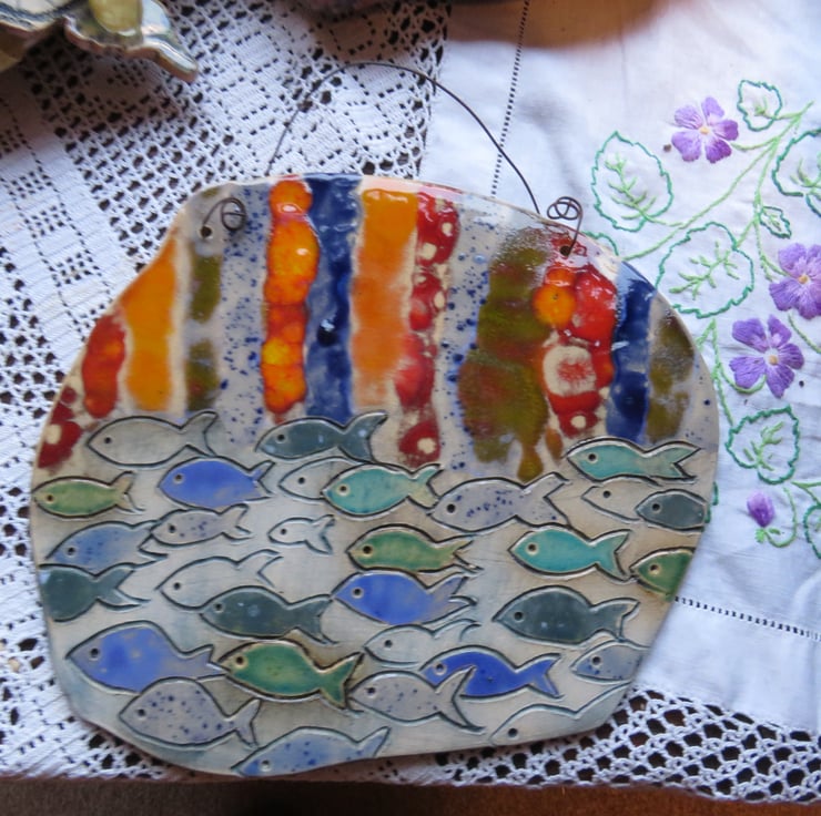 This wall hanger shows a shoul of blue fish swimming in a rainbow sea