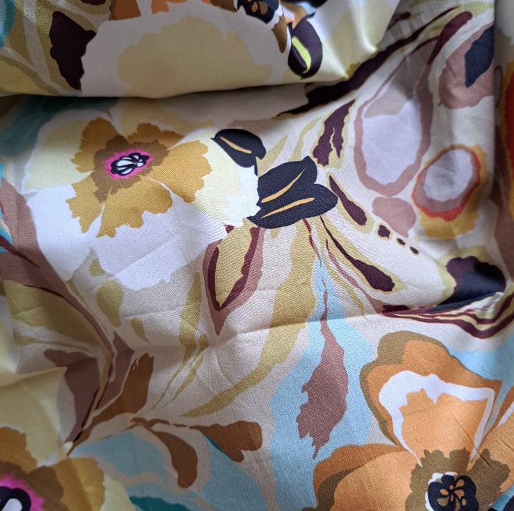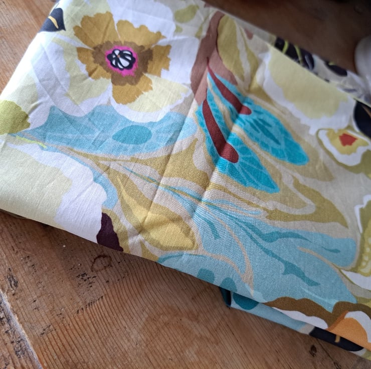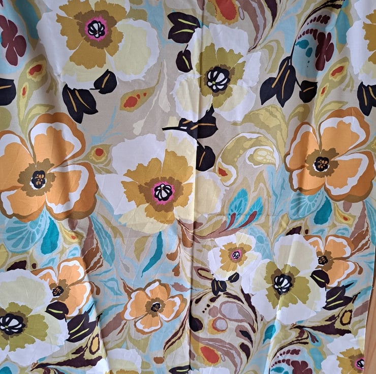 This is a beautiful piece of silky cotton lawn - by Lady McElroy, I think - featuring big and bold orange and turquoise florals on a taupe background. It measures 60cm across the selvedge and is 148cm wide. Bold and yet not bright. Tasteful.