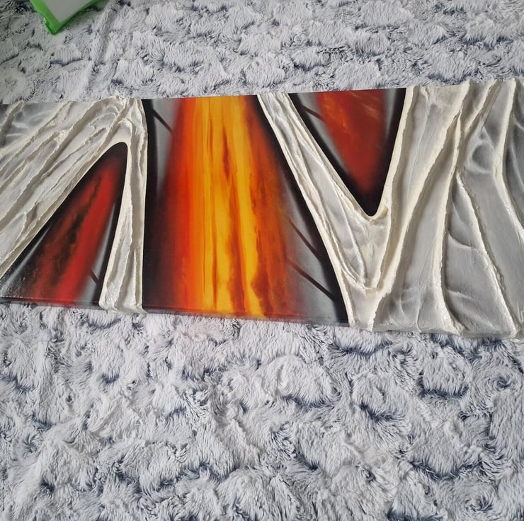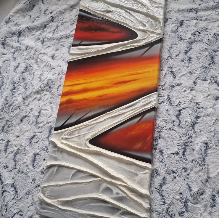 This decorative unique style painting makes any office, bedroom or living room outstanding. It intends to bring eye catching warm atmosphere wrapped into a very modern design. Eases the mind and it is very relaxing by taking the watcher above the infinite clouds. Features heavy texture on the light grey/white part of the painting.