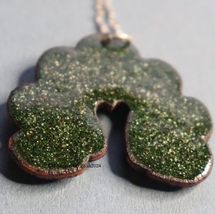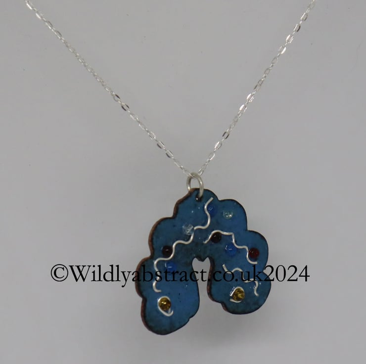 Handcrafted from a hand-pierced copper shape, this pendant was coated with pastel blue kiln-fired enamel and counter-enamelled on the reverse. Fine silver cloisonne wire was then formed in wavy shapes and placed on the enamel with glass seed beads (to resemble jewels). It was then fired in the kiln to fuse to the base metal. The pendant is suspended from a sterling silver trace chain. It measures 24cms in total length. The pendant measures 3cms x 3cms.