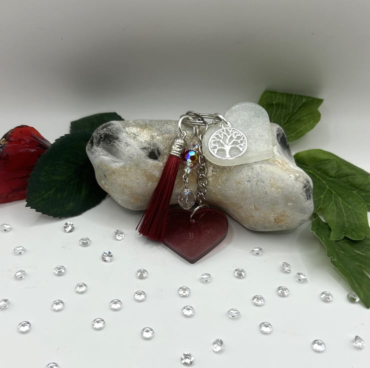 Want to give someone you love a gift which shows just how much they mean to you, then this double heart bag charm or keyring is perfect. Both hearts are handmade from eco friendly resin. The heavenly white heart is almost ethereal with it's subtle shimmer and silver plated Tree of Life round charm. In contrast, the red heart is distinctive with just a slight twinkle to it's glistening sheen. To add more sparkle there are four different sized aura borealis crystals in red and white suspended above the red heart. Lastly but not least, to finish the piece off it has a long red flowing tassel and a lobster claw clasp that swivels. All in all, a truly sumptuous and appealing accessory for any bag or outfit.