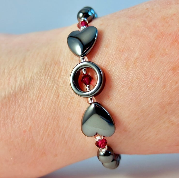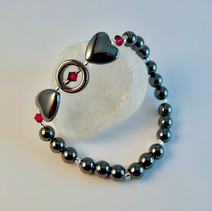 Chunky stretch bracelet made from 6mm Hematite beads featuring a pair of 12mm puffed hearts separated by a 12mm ring donut containing a 4mm quality Austrian crystal 'ruby' bicone set between a pair of Czech glass silver lined seed beads.