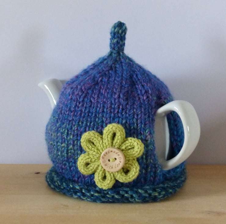 A hand knitted Tea Cosy in a chunky variegated yarn in bright shades of blue, green and purple etc. It has a 'pixie' top and a french knitted flower in a pistachio green yarn on the front for decoration. This flower has a natural wood button in the centre with the words 'Handmade With Love' on it.