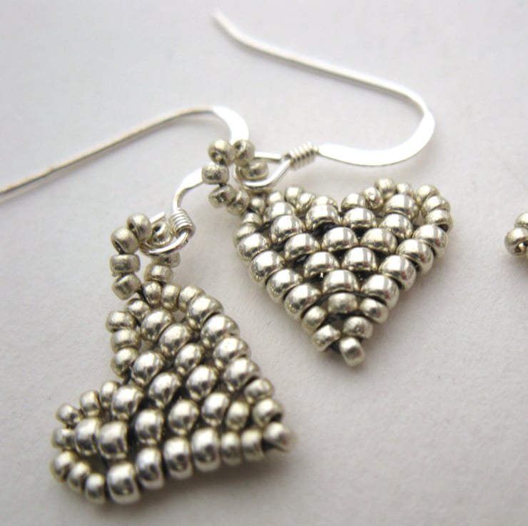 Hand beaded earrings made from tiny glass seed beads in a shiny metallic silver colour, stitched together with nylon thread. These are my own original design and tbh are so ridiculously tiny and fiddly I'm very unlikely ever to make more!