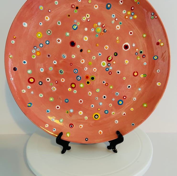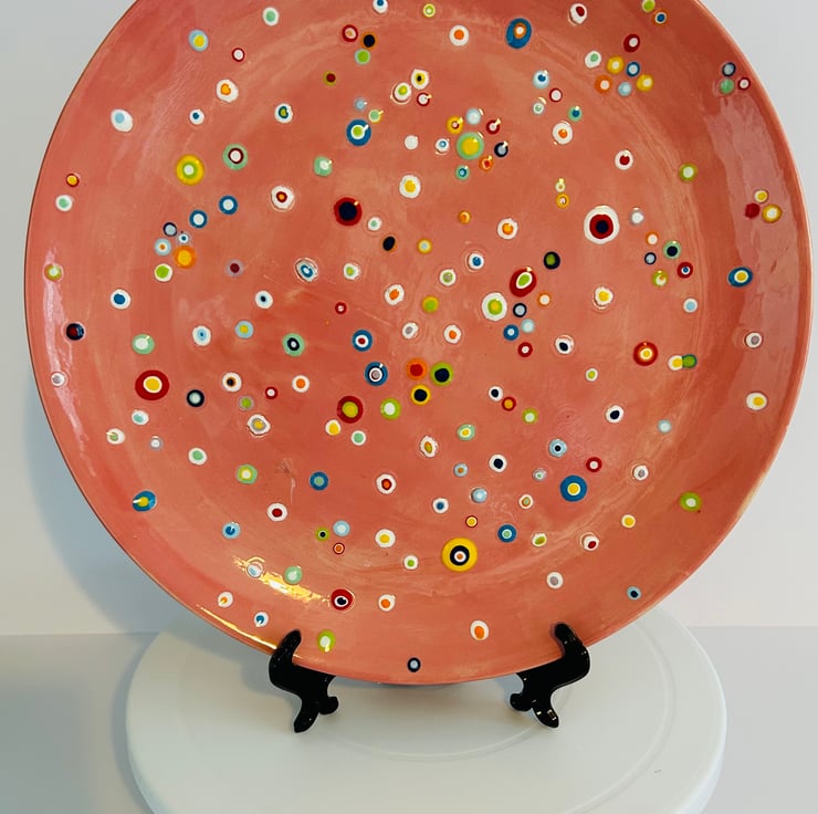 Approximately 35cm diameter plate. Pink glaze with handover atomic spots.