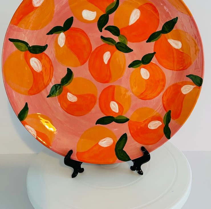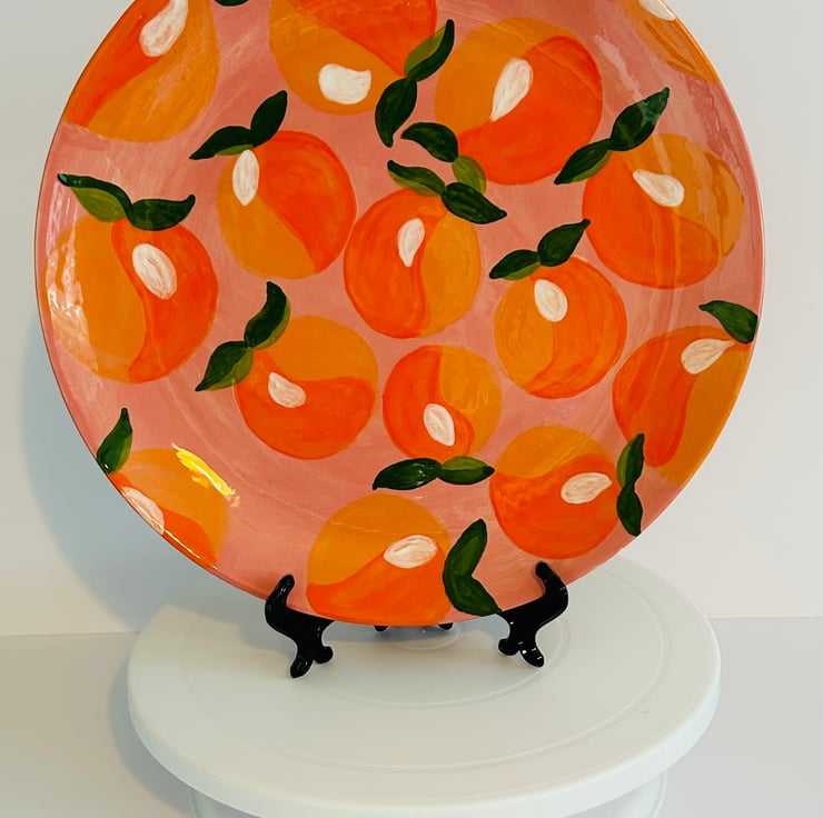 Approximately 35cm diameter. Handmade hand painted oranges on a pink background.