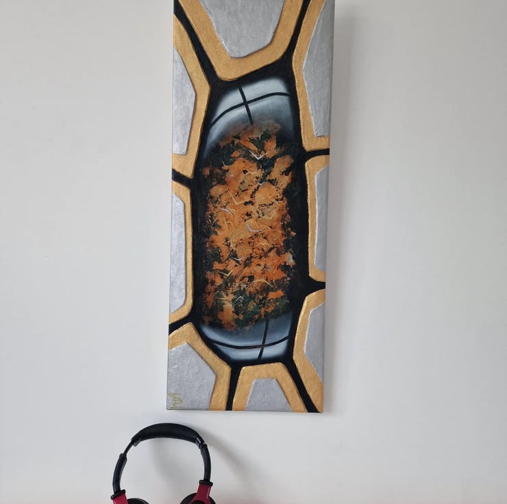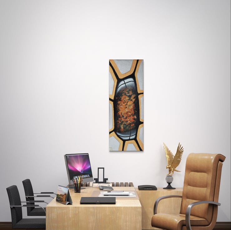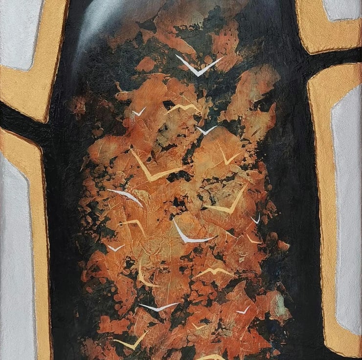 This decorative unique style painting makes any office, bedroom or living room exceptional. It intends to bring eye catching warm atmosphere wrapped into a very modern design. Eases the mind and it is very relaxing by taking the watcher into the world of abstraction. Features heavy texture, around the central part, which is a bit like a "frame" in silver and gold colour as the birds in the middle flying over the field of abstraction.